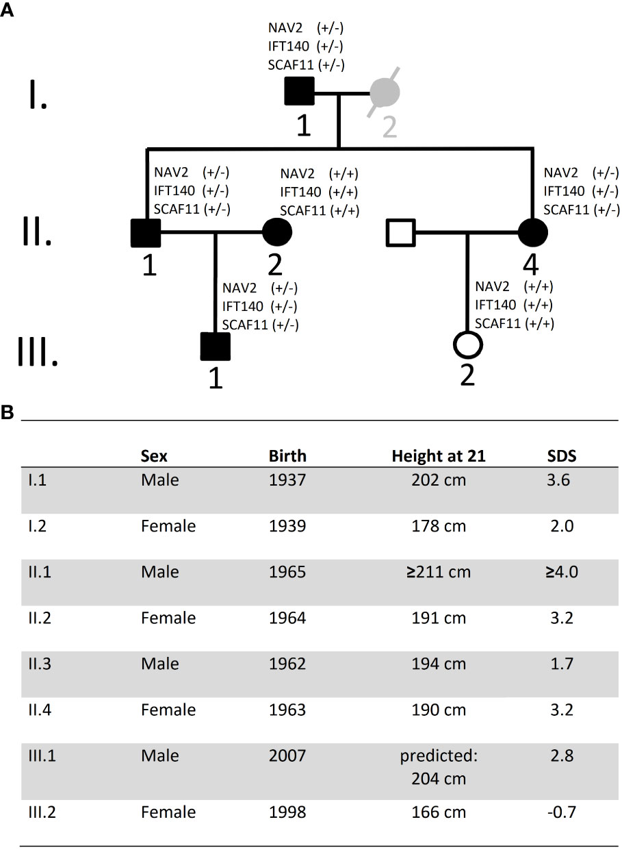 Very tall people attract much attention and represent a clinically and genetically heterogenous group of individuals. Identifying the genetic etiology can provide important insights into the molecular mechanisms regulating linear growth. We studied a three-generation pedigree with five isolated (non-syndromic) tall members and one individual with normal stature by whole exome sequencing; the tallest man had a height of 211 cm. Six heterozygous gene variants predicted as damaging were shared among the four genetically related tall individuals and not present in a family member with normal height. To gain insight into the putative role of these candidate genes in bone growth, we assessed the transcriptome of murine growth plate by microarray and RNA Seq. Two (Ift140, Nav2) of the six genes were well-expressed in the growth plate. Nav2 (p-value 1.91E-62) as well as Ift140 (p-value of 2.98E-06) showed significant downregulation of gene expression between the proliferative and hypertrophic zone, suggesting that these genes may be involved in the regulation of chondrocyte proliferation and/or hypertrophic differentiation. IFT140, NAV2 and SCAF11 have also significantly associated with height in GWAS studies. Pathway and network analysis indicated functional connections between IFT140, NAV2 and SCAF11 and previously associated (tall) stature genes. Knockout of the all-trans retinoic acid responsive gene, neuron navigator 2 NAV2, in Xenopus supports its functional role as a growth promotor. Collectively, our data expand the spectrum of genes with a putative role in tall stature phenotypes and, among other genes, highlight NAV2 as an interesting gene to this phenotype.