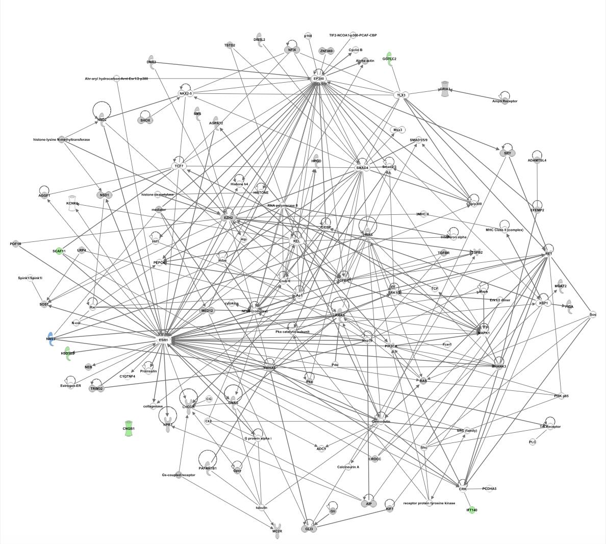 Supplementary Figure 1 | Ingenuity (IPA) Network analysis. Known genes from the literature (n=86; in green colour) underlying tall stature were analysed using the IPA network analysis. The newly identified genes were added to predict functional connections in the context of known protein networks.