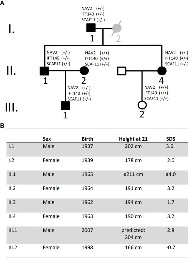Figure 1. Pedigree and height data. (A) Pedigree of family: Black symbols indicate individuals with tall stature. Individual I.2 is considered as borderline tall stature (grey symbol). White symbols indicate normal stature. Exome sequencing was carried out on DNA from individuals I.1, II.1, II.4 and III.1. DNA was also available from I.2, II.2 and III.2 but not for exome sequencing; no DNA was available from individual II.3 (declined). (B) Data on height and year of birth of Family A Height data were adjusted for secular trend and shrinking. SDS, Standard deviation score.