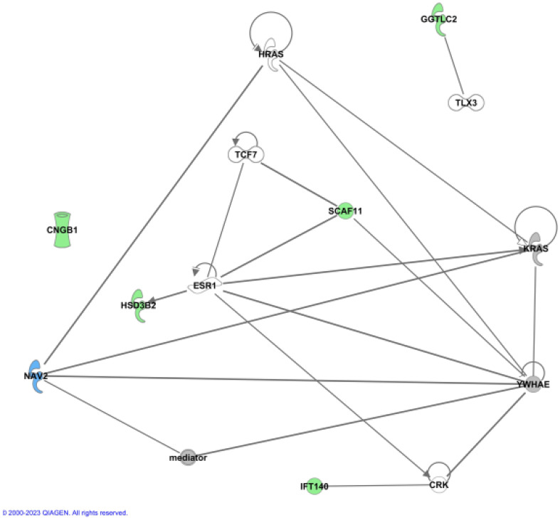 Figure 2. Ingenuity (IPA) Network analysis. The newly identified genes were used to show functional connections in context of known protein networks, based on data from the literature. No connections to known proteins could be established for CNGB1.