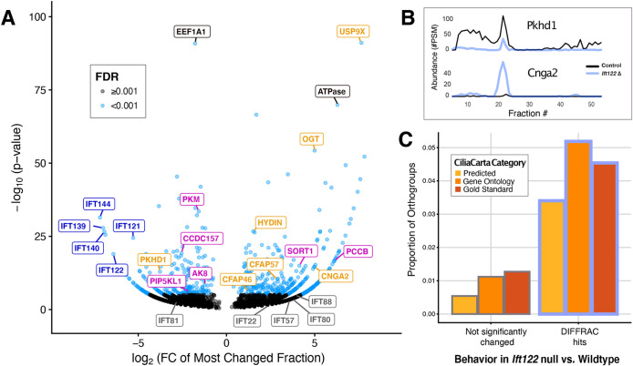 DIFFRAC is a powerful method for systematically comparing proteome content and organization between samples in a high-throughput manner. By subjecting control and experimental protein extracts to native chromatography and quantifying the contents of each fraction using mass spectrometry, it enables the quantitative detection of alterations to protein complexes and abundances. Here, we applied DIFFRAC to investigate the consequences of genetic loss of Ift122, a subunit of the intraflagellar transport-A (IFT-A) protein complex that plays a vital role in the formation and function of cilia and flagella, on the proteome of Tetrahymena thermophila. A single DIFFRAC experiment was sufficient to detect changes in protein behavior that mirrored known effects of IFT-A loss and revealed new biology. We uncovered several novel IFT-A-regulated proteins, which we validated through live imaging in Xenopus multiciliated cells, shedding new light on both the ciliary and non-ciliary functions of IFT-A. Our findings underscore the robustness of DIFFRAC for revealing proteomic changes in response to genetic or biochemical perturbation.