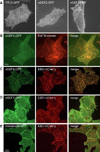 Still from Movie 1. xGEF2-GFP (green) co-localizes with EMTB-tomato-positive microtubules (red) in Xenopus NC cells. |