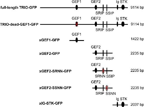 Fig. S1. Schematic representation of GFP-tagged Trio constructs. The full-length TRIO-GFP construct contains all the catalytic Trio domains. The Trio-dead-GEF1-GFP construct carries a point mutation in the GEF1 domain that eliminates its exchange activity (red X indicates the catalytically dead GEF1 domain). The xGEF1-GFP construct consists of the Xenopus N-terminal Trio DH1, PH1 and SH3 domains. The xGEF2-GFP construct consists of the Xenopus C-terminal Trio DH2, PH2 and SH3 domains, including both SxIP motifs. The xGEF2-SRNN-GFP construct carries a point mutation in the first SxIP motif (from SRIP to SRNN), which abolishes MT plus-end binding. The xGEF2-SSNN-GFP construct has a point mutation in the second SxIP motif (from SSIP to SSNN), but still co-localizes with MT plus-ends. The xIG-STK-GFP construct consists of the Xenopus N-terminal Trio Ig and STK domains. The size of all constructs is given in base pairs. |