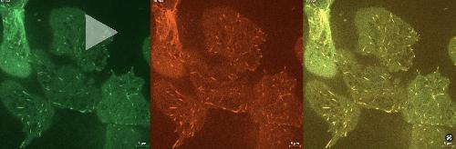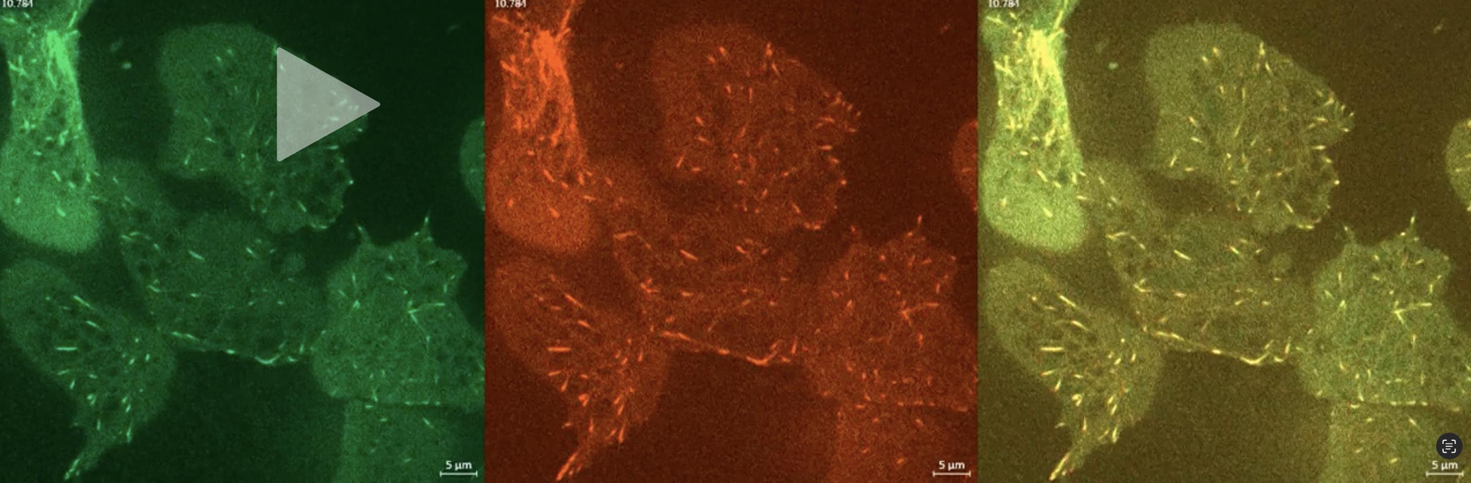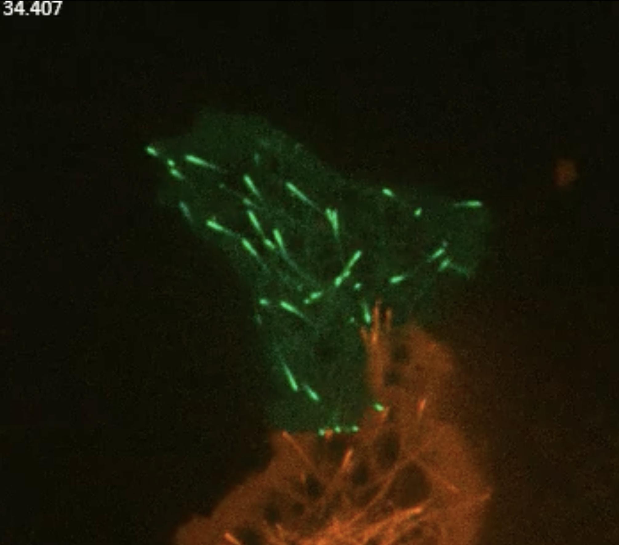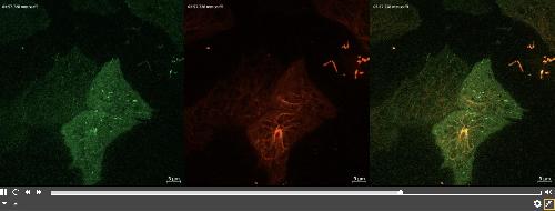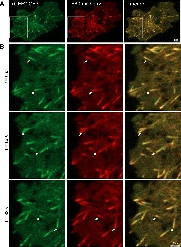 Still from Movie 2. xGEF2-GFP (green) co-localizes with EB3-mCherry in Xenopus NC cells. |