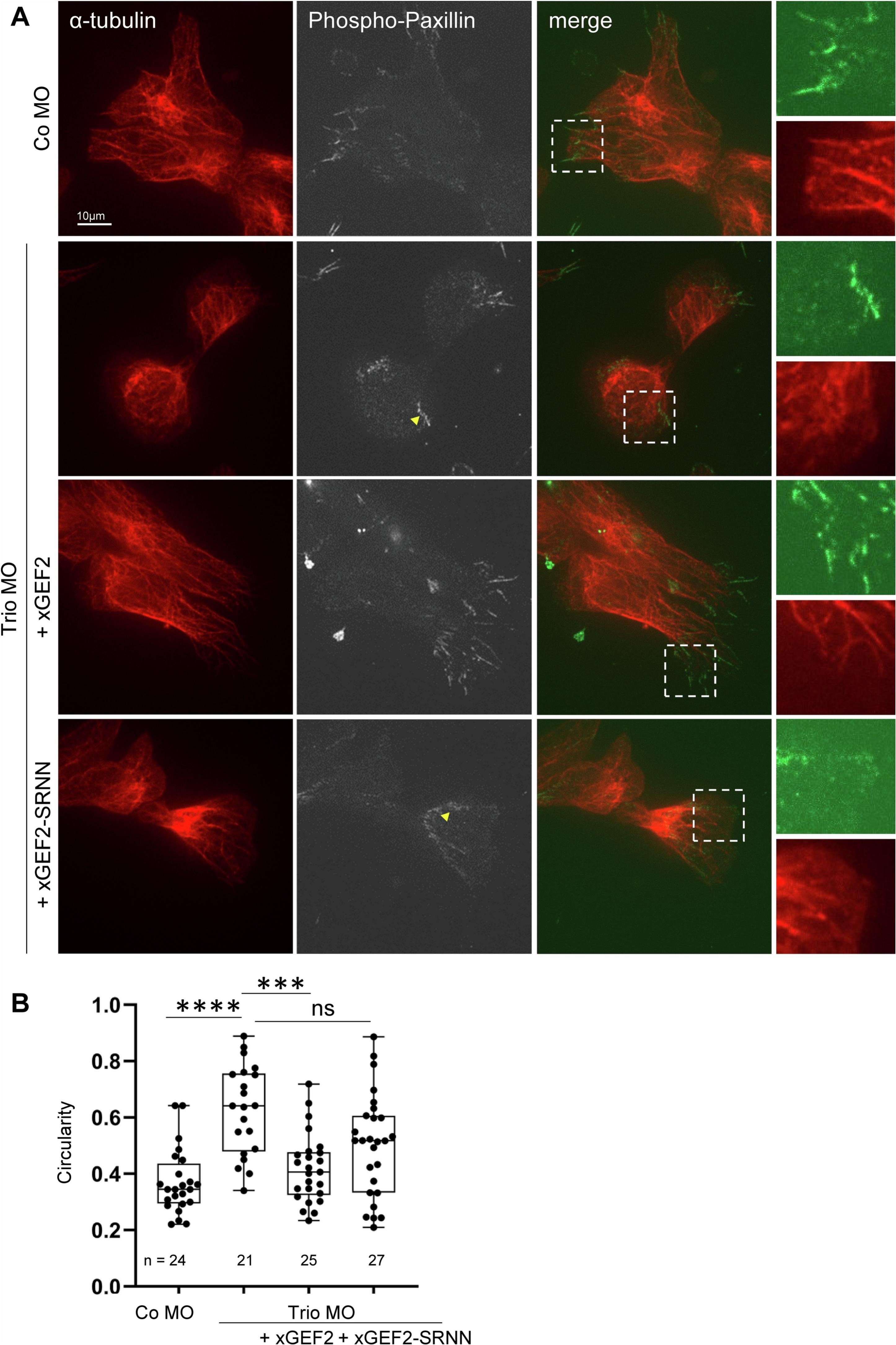 Fig. 4. Loss of Trio function disrupts the microtubule network and focal adhesion assembly. (A) Embryos were injected with 4 ng Trio MO or a control MO together with 50 pg wild-type xGEF2 or xGEF2-SRNN RNA and 300 pg H2B-mCherry mRNA as lineage tracer in one dorsal animal blastomere at the eight-cell stage. NC cells were explanted at stage 18 and migrating NC cells were analyzed by immunostaining against α-tubulin and phospho-paxillin, three independent experiments were performed α-Tubulin and focal adhesion clusters were mis-localized in Trio morphant NC cells and Trio MO and xGEF2-SRNN RNA injected samples (yellow arrows). In contrast, control MO and xGEF2 RNA injected samples showed normal α-tubulin and focal adhesion distribution. White rectangles show magnified areas of α-tubulin (red) and phospho-paxillin (green) staining. (B) Box and whiskers plot showing cell circularity measured for imaged cells analyzed as described in (A). Trio loss-of-function leads to an increase in cell circularity that can be rescued by co-injection of xGEF2 RNA, but not by xGEF2-SRNN RNA. Number of cells and median are indicated. The box extends from 25th to 75th percentile, with whiskers from minimum to maximum.**** p < 0.0001, ***p < 0.001, ns = not significant (Kruskal-Wallis test). (For interpretation of the references to colour in this figure legend, the reader is referred to the web version of this article.) |
