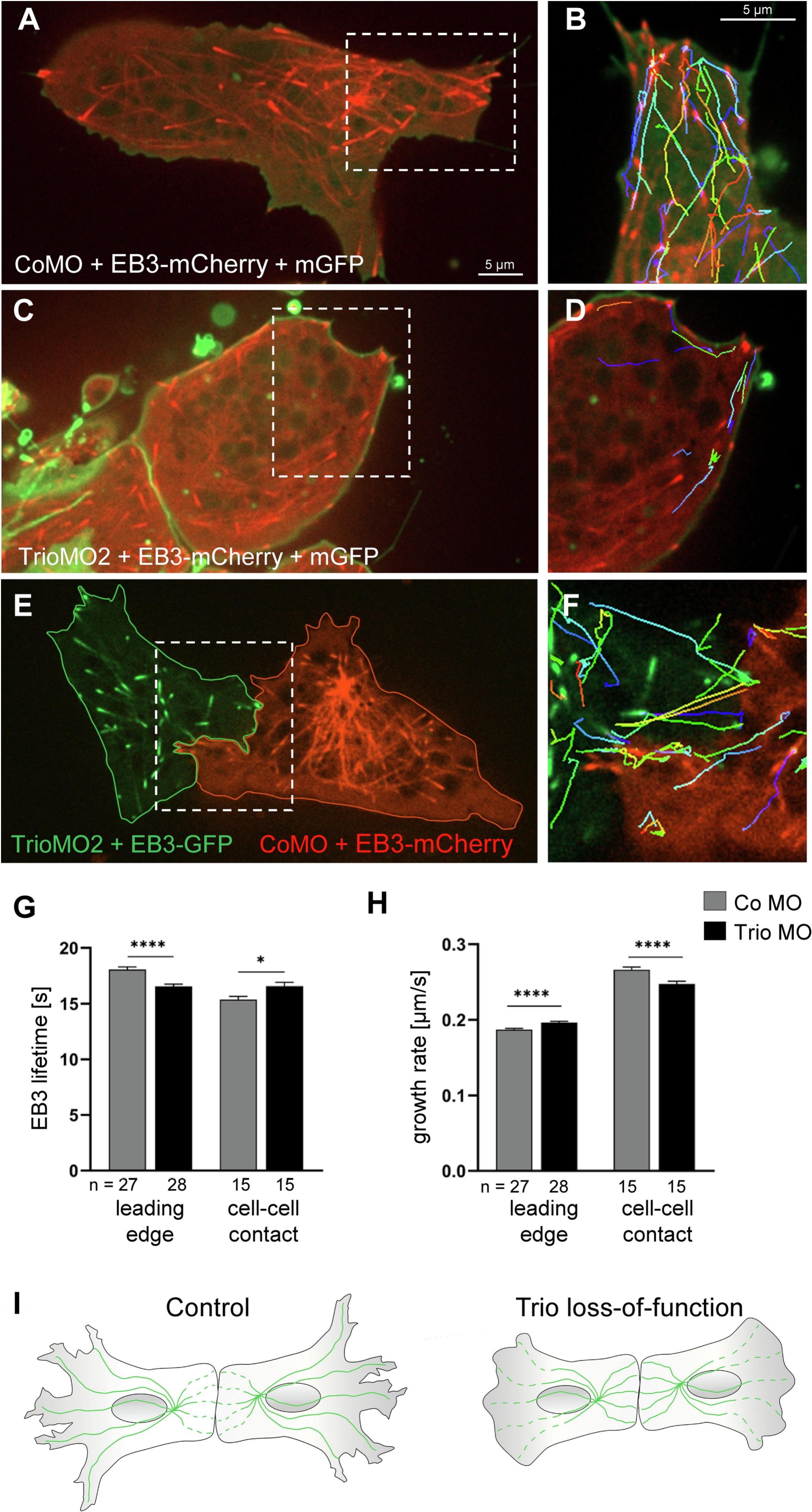 Fig. 6. Trio has distinct effects on microtubule plus-end dynamics at the leading edge and at cell-cell contact sites. Embryos were injected in one blastomere at the two-cell stage (A-D) or one blastomere at the 8-cell stage (E,F). NC cells were explanted at stage 18 and migrating NC cells were imaged every two seconds for three minutes using spinning disk microscopy. Microtubule plus-ends were tracked using the Imaris particle tracking tool. (A-D) Microtubule tracking at the leading edge of NC cells injected with 6.5 ng Trio MO or control MO in combination with 450 pg EB3-mCherry and 300 pg mGFP RNA. Single tracks are indicated by distinct colors. B and D show higher magnifications of the square shown in A,C respectively. (E-F) For microtubule tracking at cell-cell contact sites, embryos were injected with 4 ng Trio MO or a control MO in combination with 250 pg EB3-mCherry or 150 pg EB3-GFP RNA. The outer lines of cells expressing EB3-GFP or EB3-mCherry are indicated by a green or red line, respectively. F shows a higher magnification of the square shown in E. (G) Graph summarizing EB3 lifetime in seconds of four independent experiments. Number of analyzed cells (n) are indicated. (H) Graph summarizing MT plus-end growth rate in μm/s of four independent experiments. Number of analyzed cells (n) are indicated. (G-H) **** p < 0.0001, *p < 0.05; ns = not significant (Mann-Whitney test). (I) Trio loss of function impairs microtubule dynamics relevant for NC migration. In wildtype NC cells microtubules at the leading edge are more stable (solid green line) and contribute to protrusion formation, while microtubules at cell-cell contacts depolymerize fast (dashed green line) contributing to a change in cell directionality. Both of these functions are compromised in Trio morphant NC cells, with microtubules being stabilized at cell-cell contacts (solid green line) but exhibiting less stability at cell protrusions (dashed green lines) compared to the control. (For interpretation of the references to colour in this figure legend, the reader is referred to the web version of this article.) |