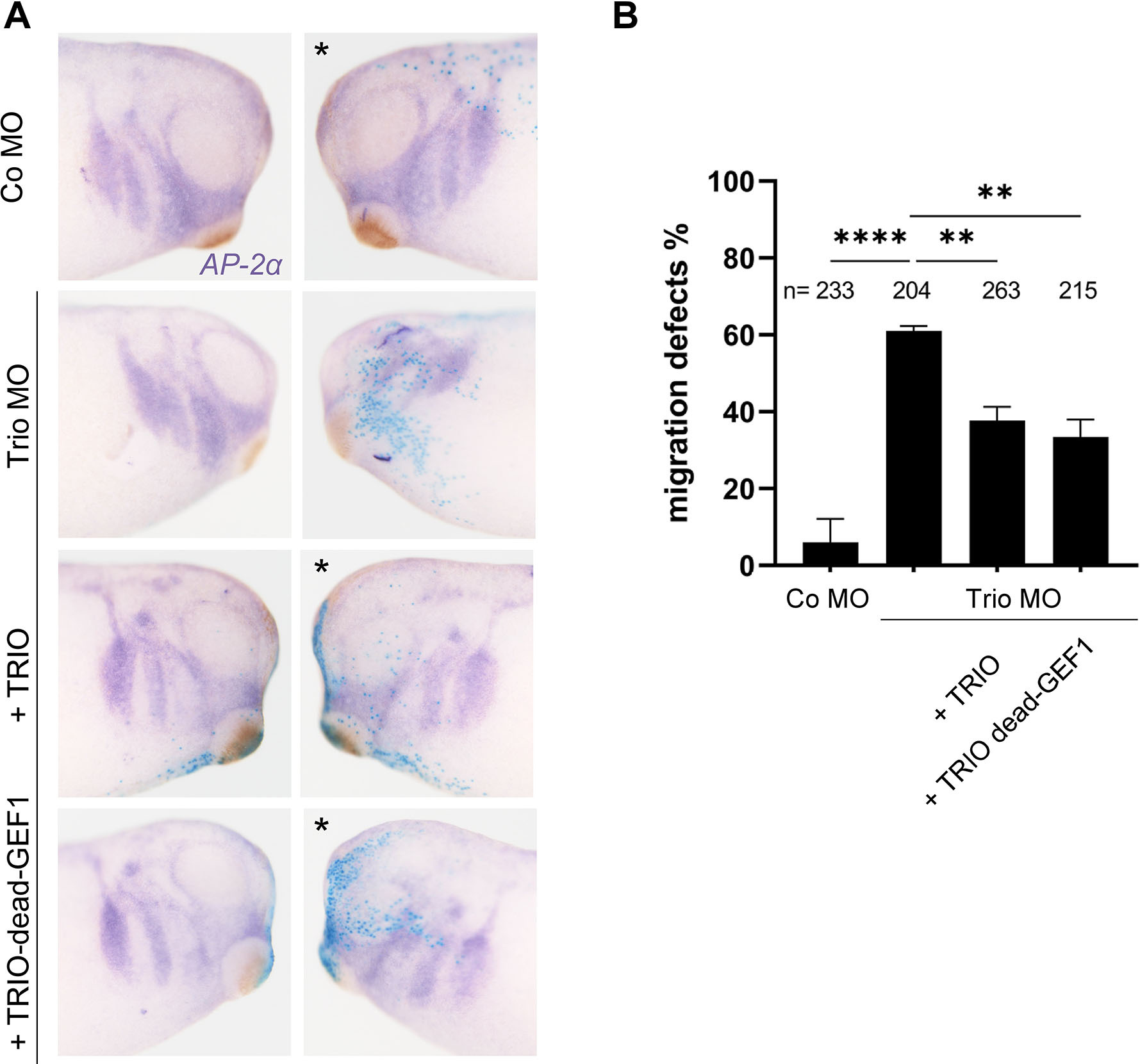 Fig. S4. Mutational inactivation of the GEF1 domain does not impair its ability to rescue the Trio morphant NC migration defects. Embryos were injected with 4 ng Trio MO alone or in combination with 30 pg full-length TRIO-GFP DNA or 30 pg TRIO-dead-GEF1-GFP DNA in one dorsal animal blastomere at the eight-cell stage. Co-injection of 100 pg lacZ RNA was used as lineage tracer and NC cell migration was analyzed by AP2-α in situ hybridization. A As shown before, Trio MO injection caused severe NC migration defects while co-injection of TRIO DNA and TRIO-dead-GEF1 DNA significantly restored in vivo NC migration. B Graph summarizing the percentage of embryos with NC cell migration defects of four independent experiments, +s.e.m. and number of injected embryos are shown. **** p < 0.0001, **p < 0.01, *p < 0.05 (one-way ANOVA). |