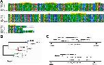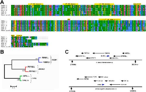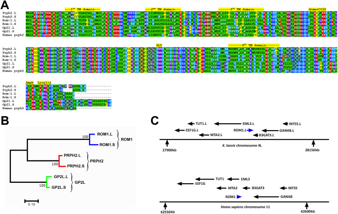 Fig. 1. Evolutionary relationships of six X. laevis Prph2 homologs. A: Alignment of translations of the six X. laevis Peripherin-2 family member sequences with human prph2. The predicted locations of the four transmembrane domains are shown (based on the cryo-EM structure of prph2) (El Mazouni and Gros, 2022), as well as the cysteine residue (C150 in the human sequence) that participates in covalent dimerization that drives oligomerization, the consensus N-linked glycosylation site, the membrane fusion/amphipathic helix motif, and the OS localization signal. B. Unrooted phylogenetic tree showing relatedness of six X. laevis Peripherin-2 family members. The “L” and “S” forms of each gene are closely related paralogs produced by a genome duplication event, and each pair of paralogs is approximately equidistant from the other gene pairs. Support for nodes in the tree evaluated using Bootstrap reanalysis (500 replicates) and reported as a percent of bootstrap trees with the node. Branch length is proportional to number of substitutions per site. C. Maps showing synteny of chromosomal regions containing X. laevis Rom1.L and human Rom1. Genes found adjacent to X. laevis Rom1.L are also adjacent to human Rom1.