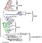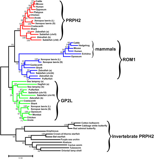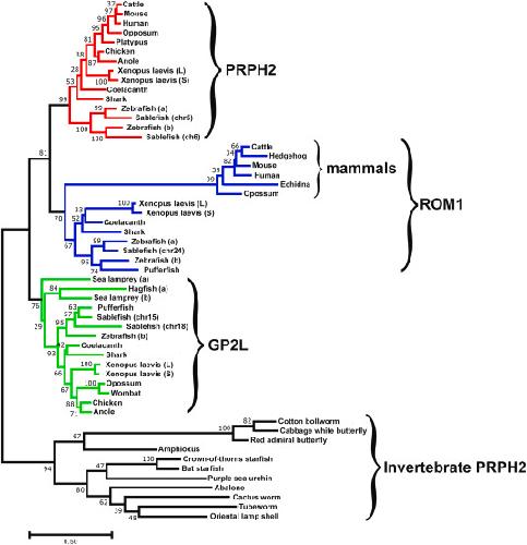 Fig. 2. Unrooted phylogenetic tree of Peripherin-2 family members generated from translated protein sequences. The sequences separate into four groups: Prph2, Rom1, Gp2l and invertebrate Prph2. Note the long branch leading to the mammalian clade in the Rom1 sub-tree. The separation of mammalian Rom1 from other vertebrate sequences is comparable to the separation of vertebrate and invertebrate Prph2, despite a much shorter evolutionary timescale, indicating mammalian Rom1 has undergone a period of accelerated evolution. Support for nodes in the tree evaluated using Bootstrap reanalysis (500 replicates) and reported as a percent of bootstrap trees with the node. Branch length is proportional to number of substitutions per site.