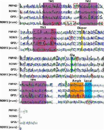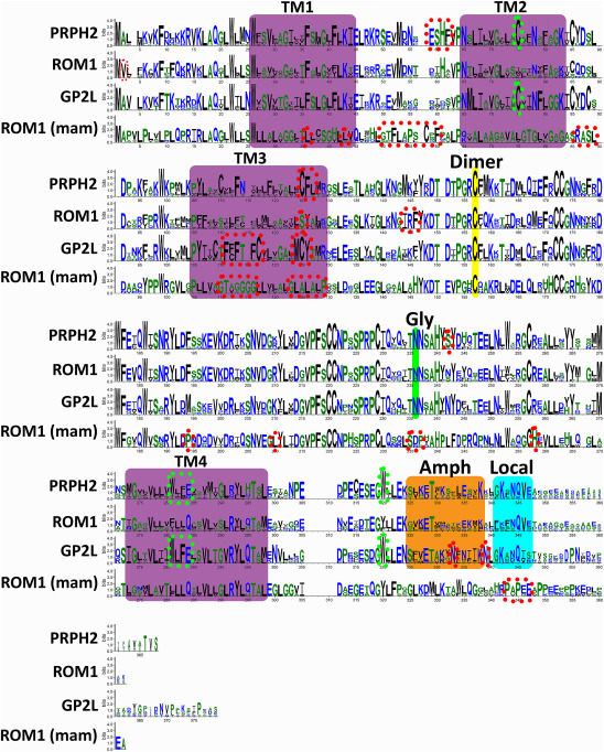 Fig. 3. Weblogos generated from translated Prph2, mammalian and non-mammalian Rom1, and Gp2l sequences listed in Fig. 2. Notable structural features of the groups are indicated: The four transmembrane domains (TM1-4, purple) based on the cryo-EM structure of prph2 (El Mazouni and Gros, 2022), the conserved cysteine involved in disulfide-linked dimerization that drives oligomerization (Dimer, yellow), the conserved glycosylation site (Gly, green), the fusion peptide/amphipathic helix motif (Amph, orange), and the localization signal (Local, blue). A number of motifs that reliably distinguish one group of sequences from the others are highlighted by red dots. Motifs that are not conserved in either group of rom1 sequences are highlighted by green dots. To maintain consistent numbering with Fig. 4, several gaps are introduced.