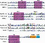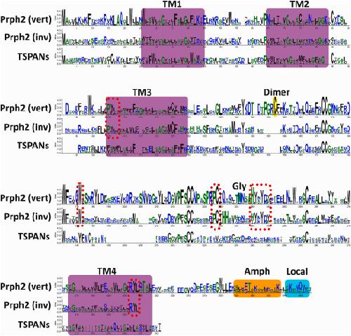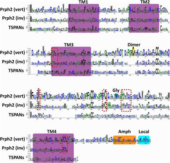 Fig. 4. Aligned Weblogos generated from translated vertebrate Peripherin-2 family members (Prph2, Rom1, and Gp2l), and invertebrate Prph2 sequences listed in Fig. 2, and a set of six non-Prph2 tetraspanins found in the X. laevis genome (TSPANs). Notable features of the groups are indicated, as in Fig. 3. A number of motifs that reliably distinguish Prph2 sequences from other TSPANs are highlighted with red dots. To maintain consistent numbering with Fig. 3, several gaps are introduced. The C-termini of individual invertebrate prph2 and TSPAN sequences typically extend beyond the last position shown, but sequence length is inconsistent and homology is unclear beyond what is illustrated.