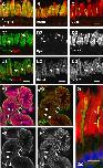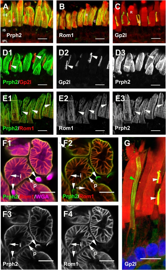 Fig. 5. Localization of prph2, rom1 and gp2l in X. laevis photoreceptors by AiryScan superesolution microscopy. A–C: Cryosectioned X. laevis tadpoleretina labeled with anti-prph2 (A), anti-rom1 (B) and anti-gp2l (C) red: wheat germ agglutinin (WGA). Green: antibody label. D1-D3: A cryosection double-labeled with anti-prph2 (green) and anti-gp2l (red). The isolated red and green channels are shown in D2 and D3. Arrowheads are examples of cone outer segments. E1-E3: A cryosection double-labeled with anti-rom1 (green) and anti-prph2 (red). The isolated green and red channels are shown in E2-E3. Arrowheads are examples of cone outer segments. F1–F4: Cross-sectioned photoreceptors triple-labeled with prph2 (green), rom1 (red) and WGA (magenta). F1: all channels, F2: green and red only, F3–F4: isolated green and red. Arrowheads indicate cone outer segments. Arrows point to incisure (i) and perimeter (p) regions. G: cryosectioned post-metamorphic X. laevis retina labeled with anti-gp2l (green) WGA (red) and Hoechst nuclear stain (blue). White arrowheads indicate cone outer segments. Green arrowhead indicates an incisure of a green rod outer segment. A-E and G: bar = 10 μm. F: bar = 5 μm.