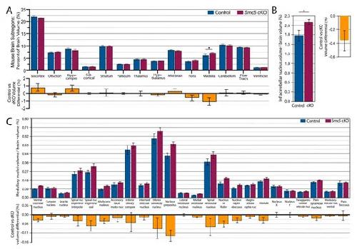 Figure 4. Smc5 cKO reduces brain volume in most regions except medulla. (A) Percentage of subregion volume compared to total brain volume of control vs smc5 cKO mice. A significant increase in medulla size is noted with Smc5 cKO. (B) The volume of the medullary infracerebellar nucleus is significantly (p = 0.03) enlarged in Smc5 cKO animals as normalized to total brain volume. (C) The medulla is uniformly enlarged across all remaining medulla subregions as demonstrated by medulla volume normalized to total brain volume; however, we see no significant differences between groups. Nuc.: nucleus, * p < 0.05, n = 12 for all experiments. |