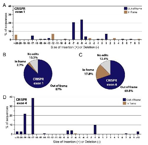 Supplementary Figure S2. CRISPR-Cas9 complexes targeting smc5 cause insertion/deletions in X. tropicalis genome (A-D) Bar graphs show frequency and size of insertion or deletion (indel) in smc5 induced by CRISPR-Cas9 activity. Pie graphs show type and frequency of indel caused by CRISPR-Cas9. Indel size in multiples of 3 correspond to in frame indels (brown), and samples without indels considered to have no edits. Indels of all other sizes considered out of frame edits (blue). DNA samples without edits not represented on bar graph. (A) CRISPR-exon 1 indel size and frequency, (B) CRISPR-exon 1 edit type and frequency, (C) CRISPR-exon 4 edit type and frequency, (D) CRISPR-exon 4 indel size and frequency. n=5 for all experiments. |