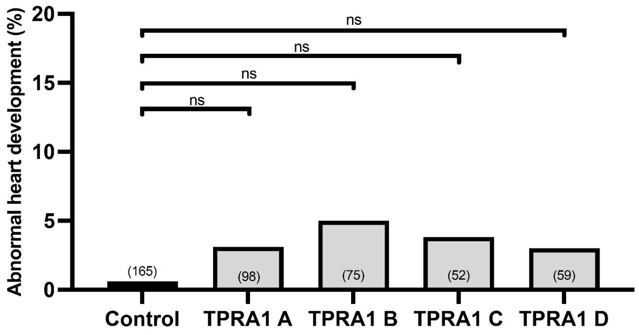 Supplementary Figure S1. tpra1 knockout in Xenopus tropicalis is not associated with cardiac defects. CRISPR-Cas9 mediated knockout of tpra1 using sgRNAs targeting using 4 separate non-overlapping target sites (Supplemental Table S2) does not cause notable developmental cardiac defects. ns: nonsignificant, numbers in parentheses indicated n values. |