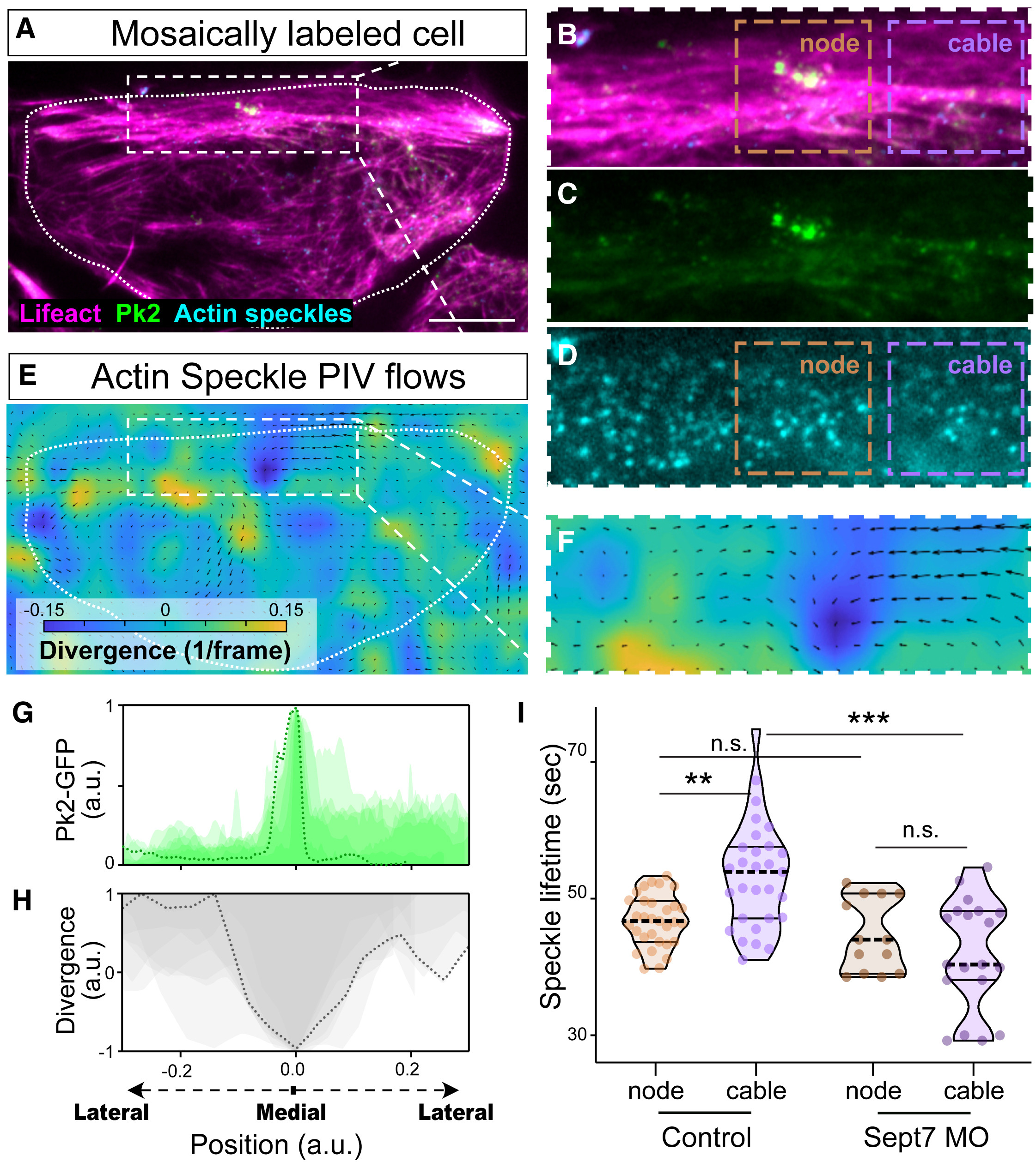 Convergent extension (CE) requires the coordinated action of the planar cell polarity (PCP) proteins1,2 and the actin cytoskeleton,3,4,5,6 but this relationship remains incompletely understood. For example, PCP signaling orients actomyosin contractions, yet actomyosin is also required for the polarized localization of PCP proteins.7,8 Moreover, the actin-regulating Septins play key roles in actin organization9 and are implicated in PCP and CE in frogs, mice, and fish5,6,10,11,12 but execute only a subset of PCP-dependent cell behaviors. Septin loss recapitulates the severe tissue-level CE defects seen after core PCP disruption yet leaves overt cell polarity intact.5 Together, these results highlight the general fact that cell movement requires coordinated action by distinct but integrated actin populations, such as lamella and lamellipodia in migrating cells13 or medial and junctional actin populations in cells engaged in apical constriction.14,15 In the context of Xenopus mesoderm CE, three such actin populations are important, a superficial meshwork known as the "node-and-cable" system,4,16,17,18 a contractile network at deep cell-cell junctions,6,19 and mediolaterally oriented actin-rich protrusions, which are present both superficially and deeply.4,19,20,21 Here, we exploited the amenability of the uniquely "two-dimensional" node and cable system to probe the relationship between PCP proteins, Septins, and the polarization of this actin network. We find that the PCP proteins Vangl2 and Prickle2 and Septins co-localize at nodes, and that the node and cable system displays a cryptic, PCP- and Septin-dependent anteroposterior (AP) polarity in its organization and dynamics.