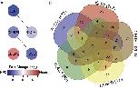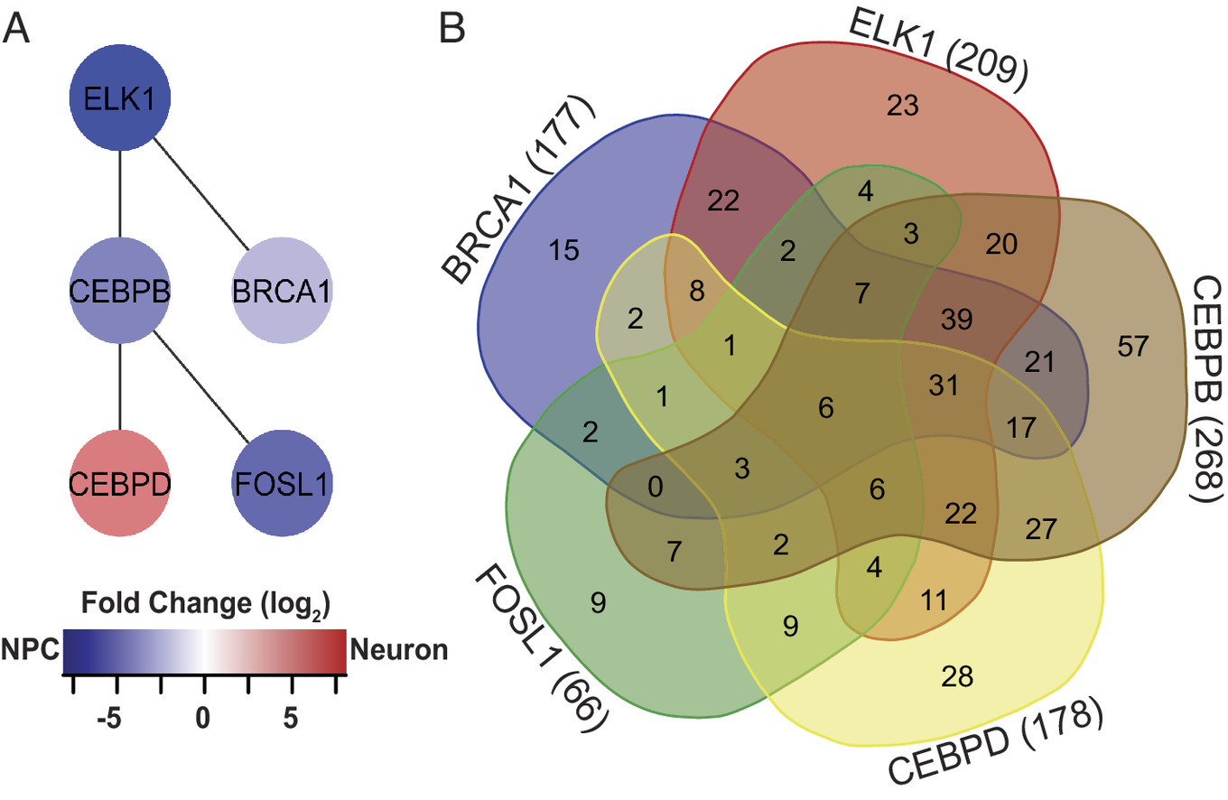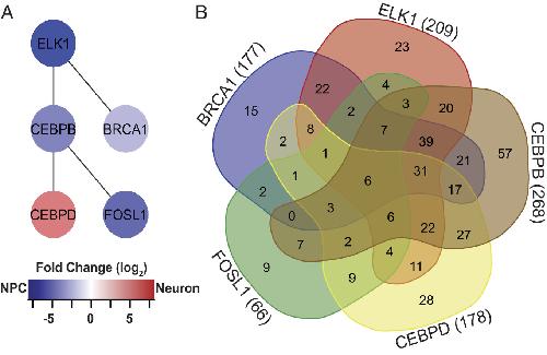 Fig. 3. Network of differentially expressed transcriptional regulators. (A) ELK1, BRCA1, CEBPB, CEBPD, and FOSL1 form a network of DE transcription factors that regulates other DE transcription factors. Color refers to fold change enrichment between NPCs (blue) and neurons (red). (B) 5-way Venn diagram showing the numbers of transcripts targeted by the 5 DE transcription factors in (B). For specific targets, see SI Appendix, Table S3. |