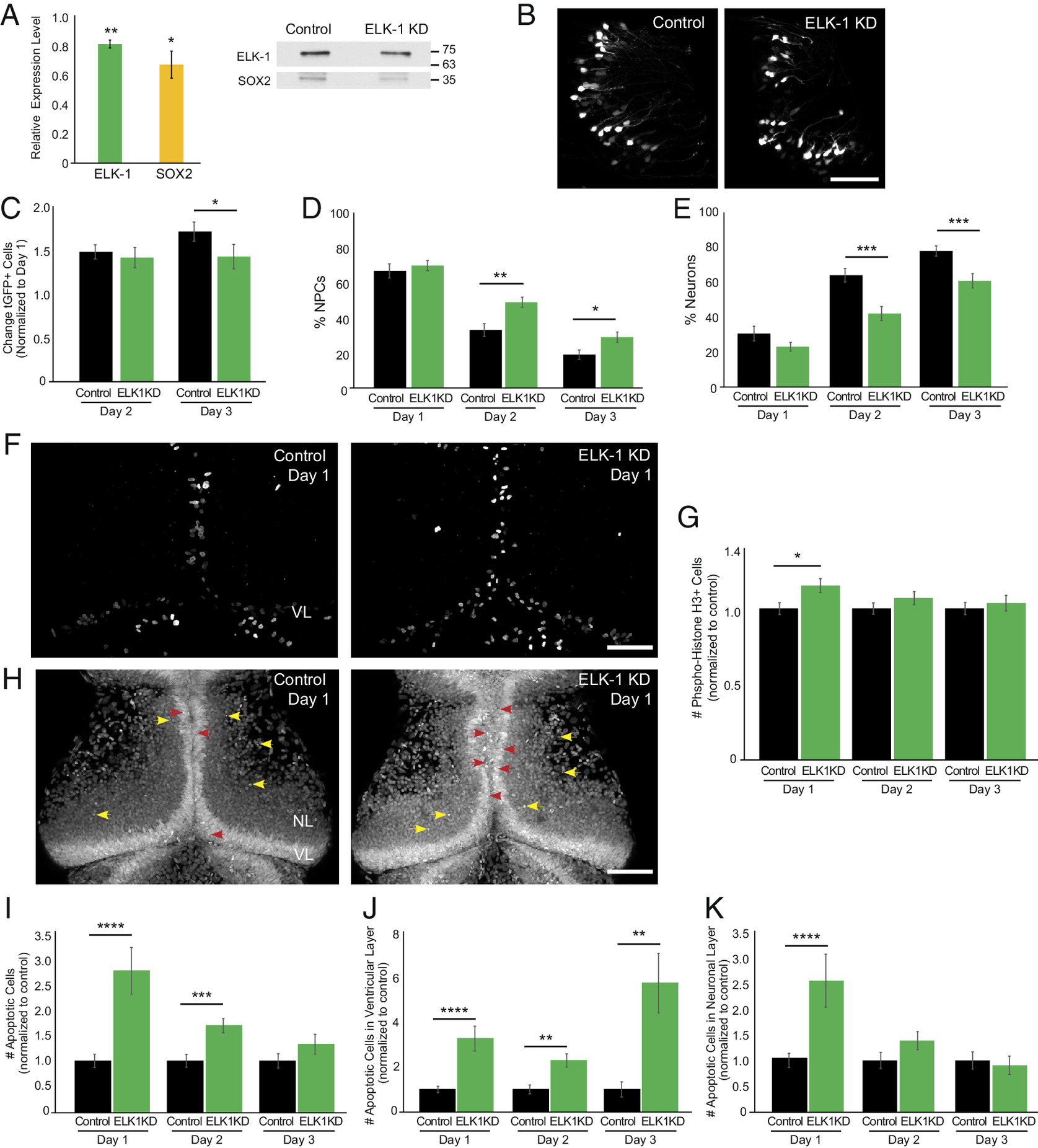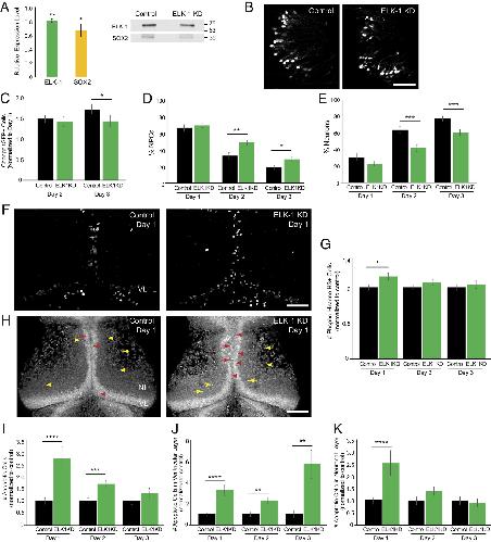 ELK-1 regulates neural progenitor cell fate. (A) elk-1 morpholino reduces ELK-1 (green, n = 3) and SOX2 (yellow, n = 3) compared to control morpholino-treated animals. Midbrains were dissected for western blots 2 d after electroporating morpholinos. Blots were normalized to Ponceau staining for quantification. (B) Representative in vivo images of tGFP+ cells in the optic tectum from control morpholino-treated animals and ELK-1 KD animals. The experimental protocol is shown in Fig. 4C. (Scale bar: 100 µm.) (C) ELK-1 KD significantly reduces the total number of tGFP+ progeny number on day 3 compared to control morpholino-treated animals. n = 12 animals per condition. (D and E) ELK-1 KD significantly increases the percentage of NPCs (D) and decreases neurons (E) in total eGFP+ cells compared to control morpholino-treated animals. (F) Confocal Z-projection of phospho-Histone H3 (pH3) immunolabeling in control morpholino-treated animals and ELK-1 KD tecta. (Scale bar: 100 µm.) (G) ELK-1 KD increases pH3+ cells on day 1 compared to control morpholino-treated animals. n = 40 to 52 animals per group/timepoint. (H) Confocal Z-projection images of SYTOX+ apoptotic nuclei in NPCs in the ventricular layer (VL) on day 1 (red arrowheads) and apoptotic neurons in the neuronal layers (NL, yellow arrowheads). (Scale bar: 100 µm.) (I) ELK-1 KD significantly increases the total number of apoptotic cells on days 1 and 2 compared to control morpholino-treated animals. n = 39 to 51 animals per group/timepoint. (J and K) ELK-1 KD significantly increased apoptosis in NPCs across all days tested (J) and in neurons on day 1 (K) compared to control morpholino-treated animals. *P < 0.05, **P < 0.01, ***P < 0.001, and ****P < 0.0001; one-tailed Student’s t test in (A); Mann–Whitney U test in (C–E), (G), and (I–K). |