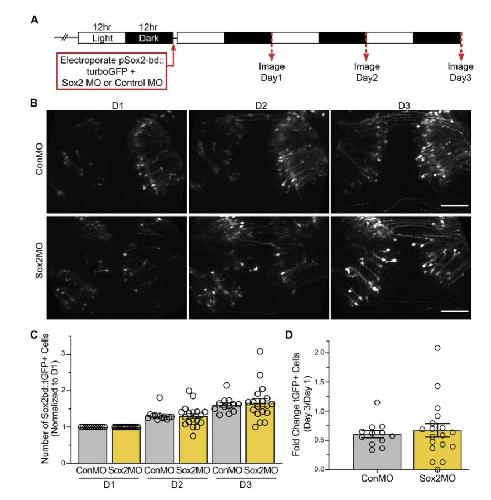 groups. D. Difference in fold-change of Sox2bd::tGFP positive cells over the 3 day experiment is not significant