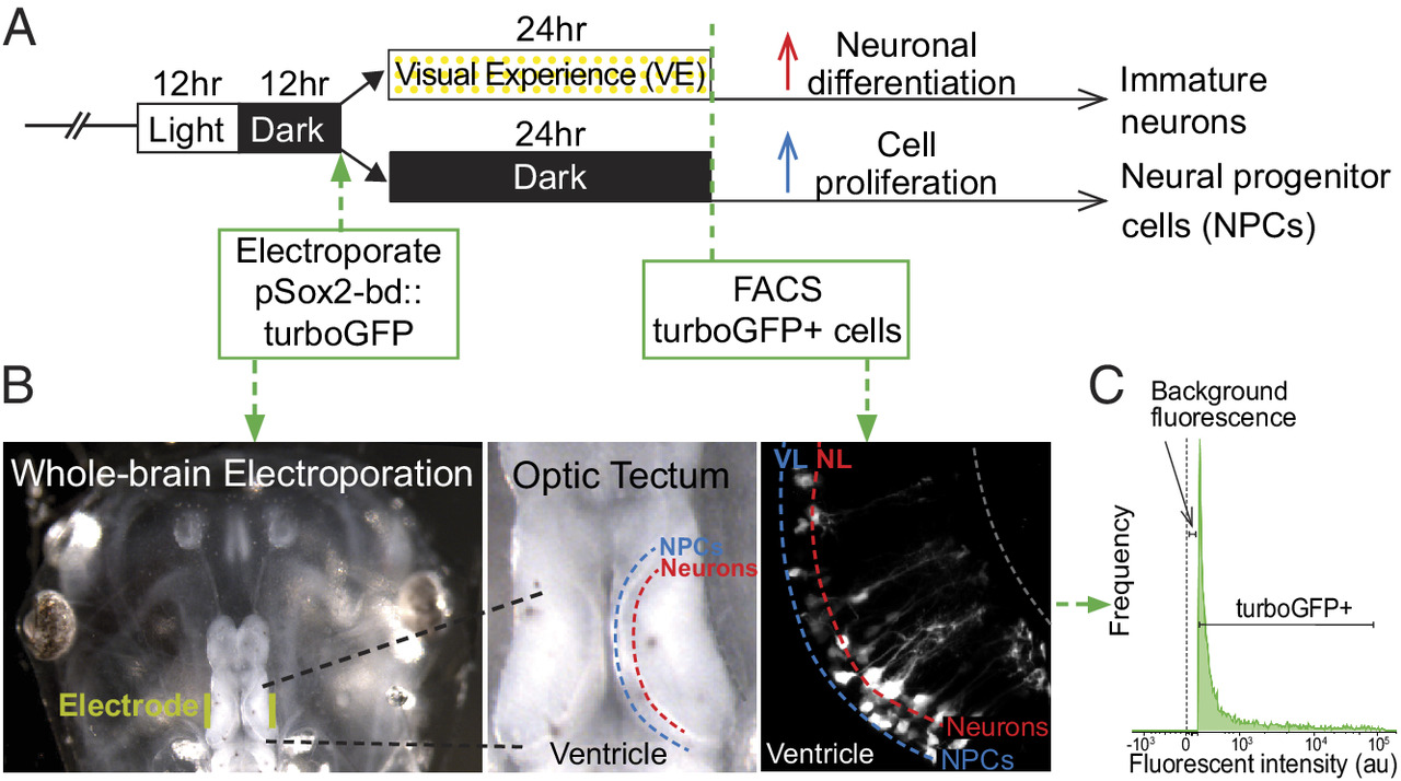 Isolation of neural progenitor cells and immature neurons from the optic tectum. (A) Visual experience paradigm used to enrich for NPCs and immature neurons. Animals were reared in 12 h light/12 h dark until stage 46 when the midbrain was electroporated with pSOX2-bd::tGFP plasmid. After electroporation, animals were randomly divided into two groups, one exposed to enhanced visual experience (VE) for 24 h. (B) Whole brain electroporation labels NPCs and neurons in the optic tectum. Left: Image of the head of the tadpole with electrodes (yellow) on each side of the optic tectum. Middle: Dorsal view of the optic tectum. The ventricle, NPC layer, and neuronal layer are labeled. Right: in vivo 2-photon image of tGFP-labeled NPCs and neurons in the ventricular layer (VL) and neuronal layer (NL). (C) Fluorescence histogram indicates the gate setting of the fluorescence-activated cell sorting (FACS) to isolate tGFP+ cells. Control is set to the background fluorescence from nonelectroporated midbrain cells. |