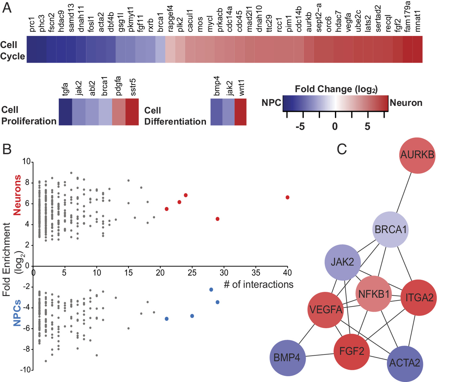 Bioinformatic analysis of differentially expressed transcripts identifies functional categories and interaction networks. (A) Fold change of transcript expression between NPCs and immature neurons in GO biological processes: cell proliferation, cell differentiation, and cell cycle. (B) Protein interaction network analysis of DE transcripts, arranged by number of binding partners (interactions) in NCPs (blue) and neurons (red). (C) Network analysis of the nine transcripts highlighted in (B) with the most binding partners, blue indicates genes up-regulated in neural progenitor cells and red indicates increased expression in immature neurons. Fold change scale applies to (A) and (C).