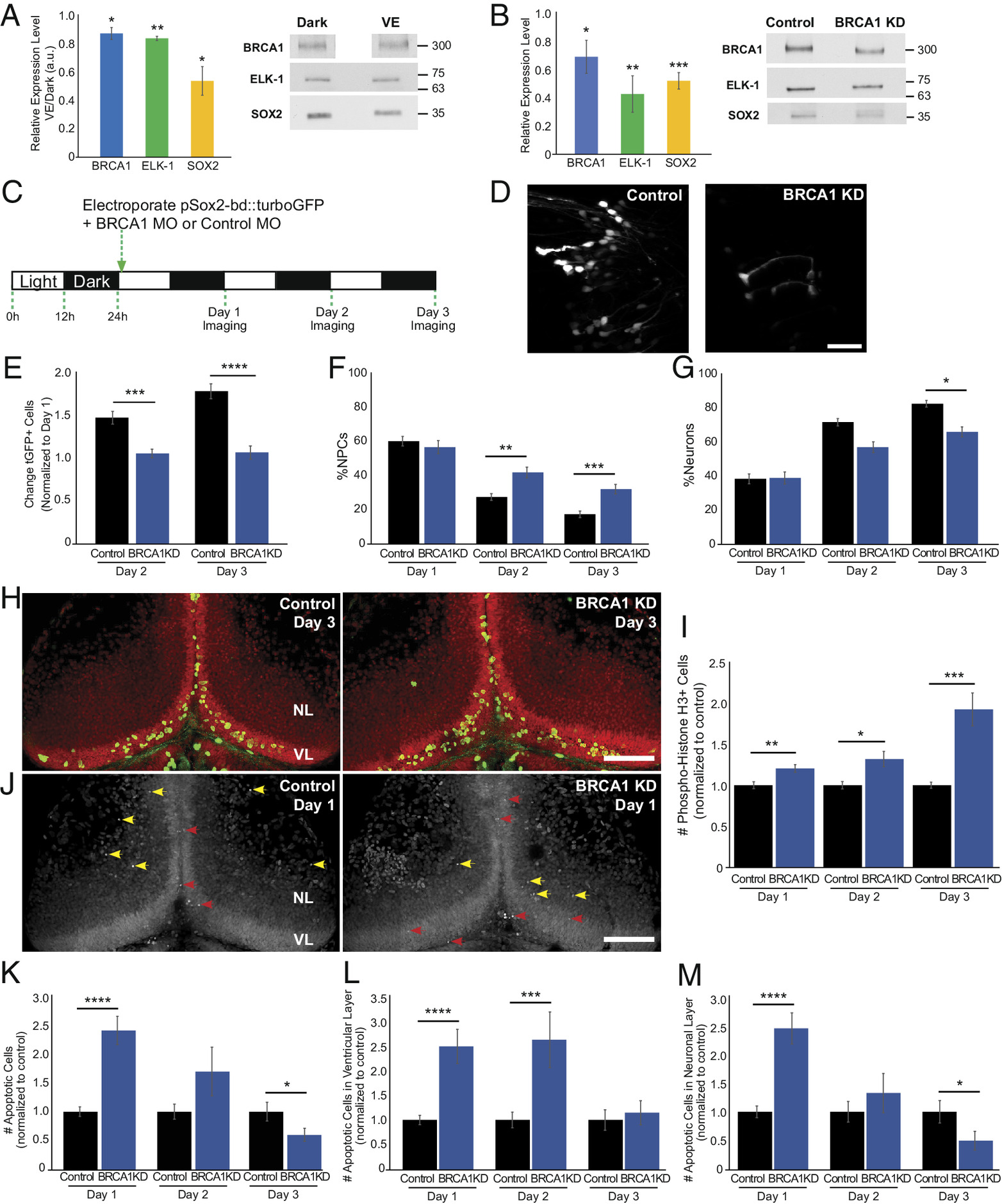 BRCA1 regulates neural progenitor cell fate. (A) BRCA1 (blue), ELK-1 (green), and SOX2 (yellow) expression are increased in animals maintained in the dark compared to enhanced visual experience (VE). Quantitation, normalized to Ponceau staining (Left). n: BRCA1 (5); ELK-1 (4), SOX2 (4). (B) BRCA1 knockdown lowers BRCA1 (blue, n = 5), ELK-1 (green, n = 6), and SOX2 (yellow, n = 6) protein expression. Midbrains were dissected for western blots 2 d after electroporating morpholinos. (C) Diagram of in vivo imaging protocol. Animals were maintained in a 12 h light/12 h dark cycle. After coelectroporation with tGFP and brca1 or control morpholinos, animals were imaged for 3 consecutive days. (D) Representative in vivo images of tGFP+ tectal cells from control morpholino and BRCA1 KD animals. (Scale bar, 50 µm.) (E) BRCA1 KD significantly reduced tGFP+ cell numbers compared to control morpholino-treated animals on days 2 and 3. n = 45 to 46 animals per condition. (F and G) Of the cells shown in (E), the percentage of NPCs significantly increased (F) and neurons decreased (G) with BRCA1 KD compared to control morpholino treatment. (H) Z-projection images showing pH3 immunolabeling (green) and SYTOX nuclear labeling (red) on day 3 in the ventricular layer (VL) and neuronal layer (NL). (Scale bar: 100 µm.) (I) BRCA1 KD significantly increased the total number of pH3+ cells in the tectum compared to control morpholino-treated animals over 3 d. n = 37 to 48 animals per group/timepoint. (J) Confocal Z-projection images of SYTOX-labeled apoptotic nuclei in NPCs in the ventricular layer on day 1 (VL, red arrowheads) and apoptotic neurons in the neuronal layers (NL, yellow arrowheads). (Scale bar: 100 µm.) (K) BRCA1 KD significantly affected the total number of apoptotic cells compared to control morpholino-treated animals. n = 34 to 38 animals per group/timepoint. (L and M) Of the cells shown in (K), BRCA1 KD significantly increased apoptosis in NPCs on days 1 and 2 (L) and in neurons on day 1 compared to control morpholino-treated animals. (M) *P < 0.05, **P < 0.01, ***P < 0.001, and ****P < 0.0001; two-tailed Student’s t test in (A); one-tailed Student’s t test in (B); Mann–Whitney U test in (E–G), (I), and (K–M). |