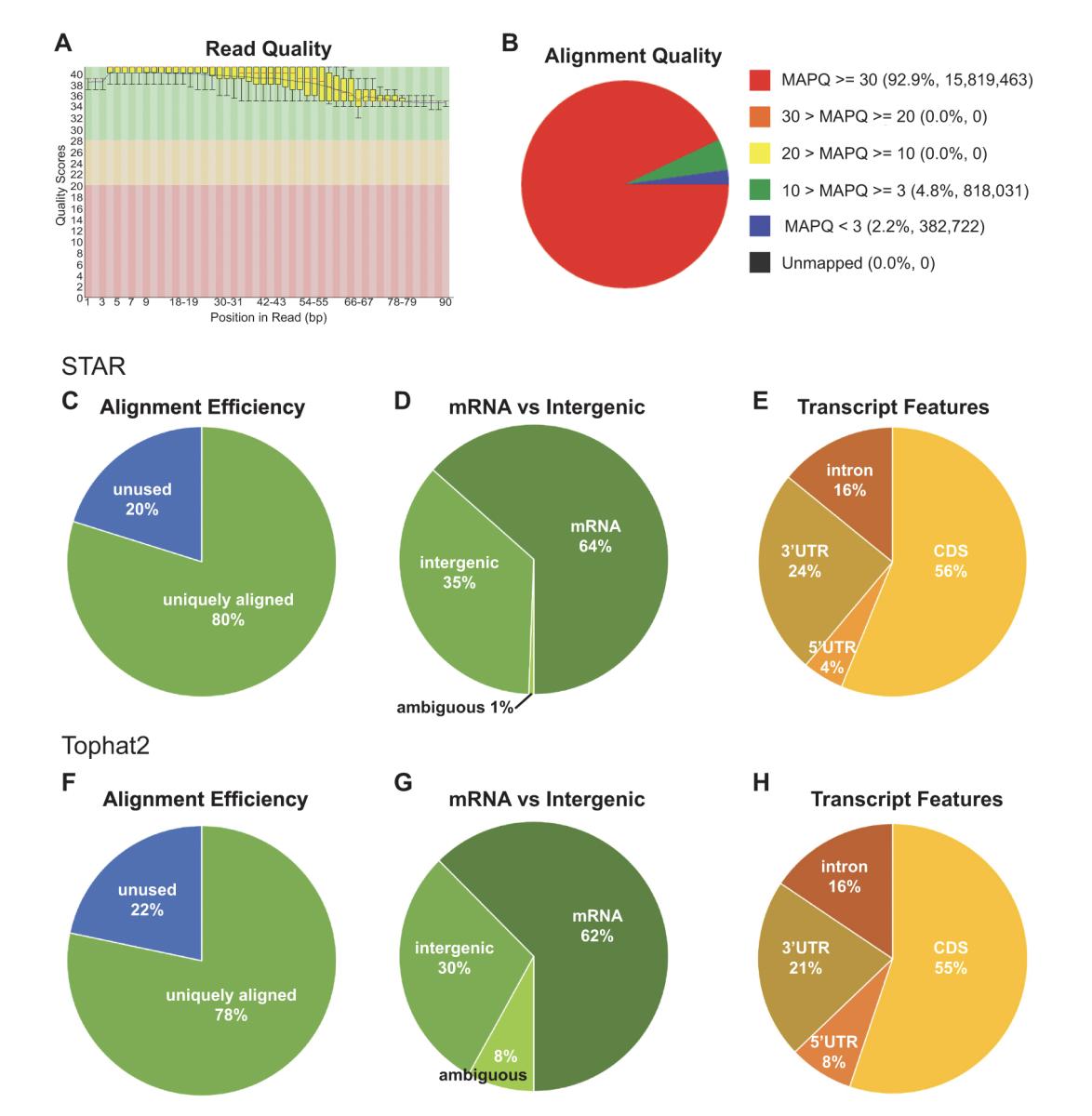 using STAR. C. 80% of RNA-seq reads in average are uniquely aligned to the genome scaffolds, indicating