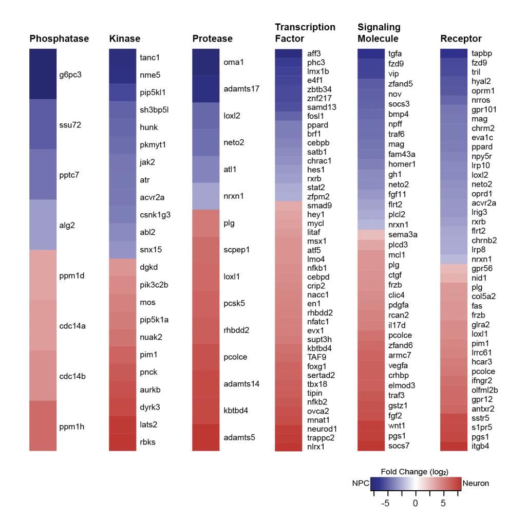 changes between progenitors and neurons. Protein expression is graphed relative to expression NCPs (blue)