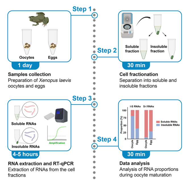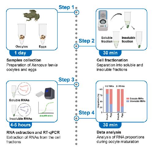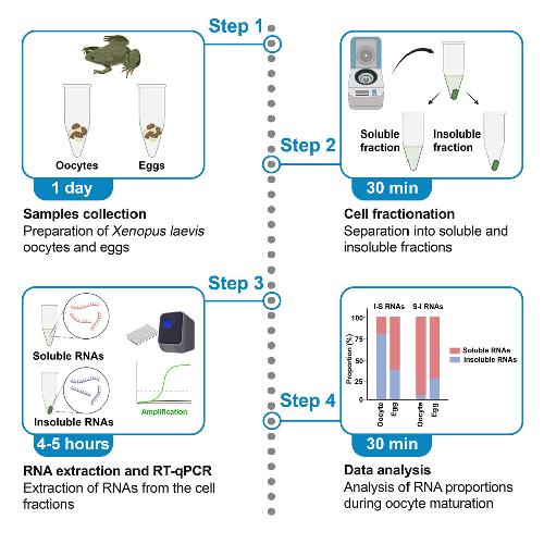 While RNAs are soluble in vitro, their solubility may be altered when incorporated into some protein complexes inside the cell. The solubility phase transition of RNAs is thus indicative of changes in the function and activity of RNAs. Here, we present a protocol for the assessment of RNA solubility phase transition during Xenopus oocyte maturation. We describe steps for sample preparation, cell fractionation, RNA extraction, real-time PCR, and analysis of the obtained results. For complete details on the use and execution of this protocol, please refer to Hwang et al. (2023).1.