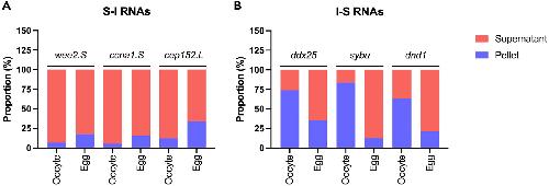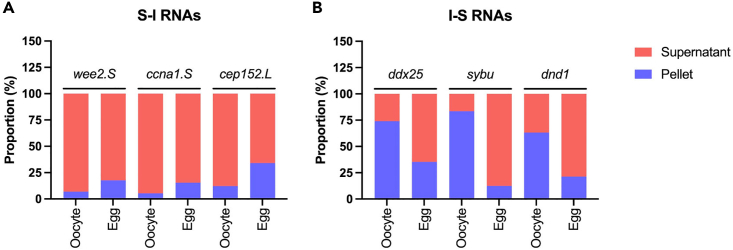 Figure 3. Representative results of fractionation RT-qPCR(A) The percentage distribution of S-I RNAs, including wee2.S, ccna1.S, and cep152.L, in the soluble and insoluble fractions (Table 2).(B) The percentage distribution of I-S RNAs, including ddx25, sybu, and dnd1, in the soluble and insoluble fractions (Table 3).