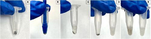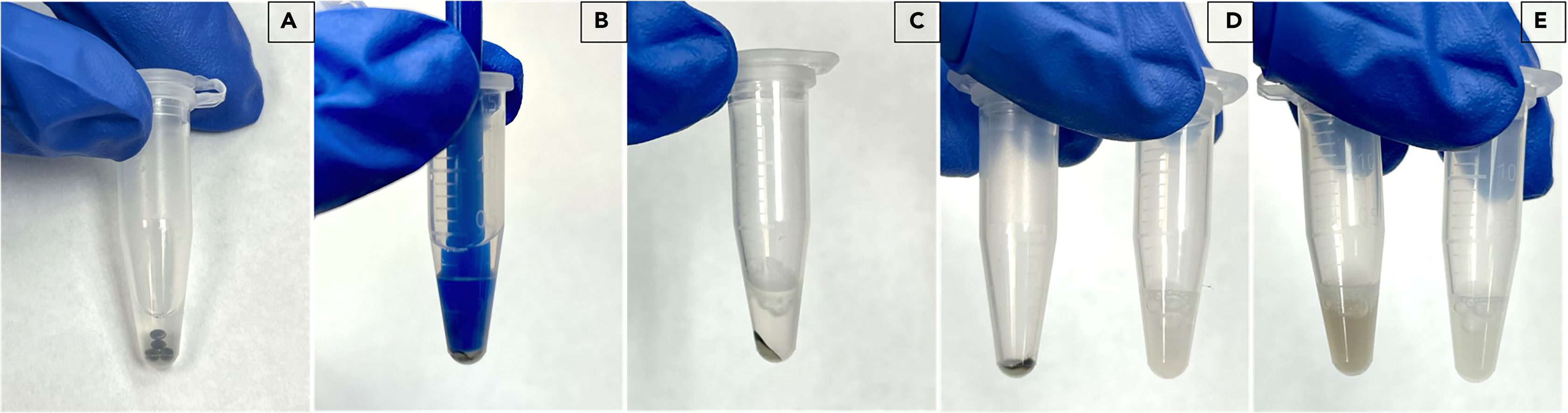 Figure 1. Cell fractionation procedure for separation into soluble and insoluble fractions(A) Collection of four oocytes in a tube.(B) Homogenization of samples with a micro pestle.(C) Image of cell fraction after centrifuge.(D) Supernatant (soluble) and pellet (insoluble) fractions.(E) Image after resuspending pellet.