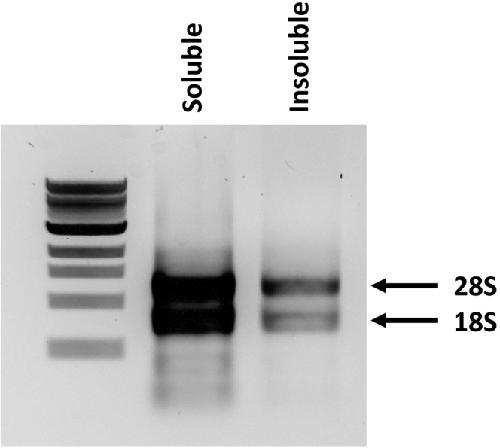Figure 2. Assessment of the integrity of isolated RNAsThe gel electrophoresis image shows 18S and 28S rRNA from soluble and insoluble RNAs.