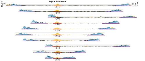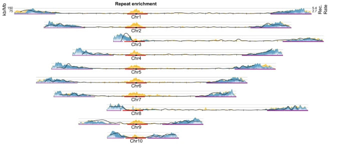 Fig. 2: Density of pericentromeric and subtelomeric repeats in Xenopus tropicalis. Pericentromeric (red) and subtelomeric (purple) regions were used to obtain enriched repeats, excluding chromosomes with short p-arms (chromosomes 3, 8, and 10). Pericentromeric repeats (yellow) correspond to selected subsets of non-LTR retrotransposons (CR1, L1, and Penelope), LTR retrotransposons (Ty3), and DNA transposons (PiggyBac and Harbinger). Subtelomere-enriched repeats (blue) correspond mainly to satellite repeats and LTR retrotransposons (Ty3, Ngaro). Densities of each repeat type plotted as kb/Mb. Chromosomes are centered by the position of centromeric tandem repeats (black dots). Rates of recombination (Rec. rate) in cM/Mb are shown as solid black lines. Tick marks indicate 10 Mb blocks (Supplementary Fig. 5). kb kilobases, Mb megabases, cM centiMorgans. Source data are provided as a Source Data file. |