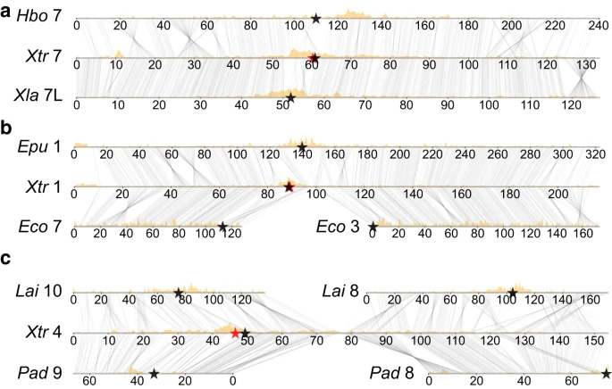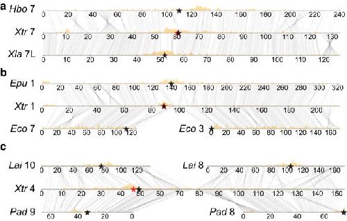 Fig. 3: Subtelomeric repeats highlight regions of chromosome fusion. Examples of (a) conserved structure and pericentromere maintenance of H. boettgeri (Hbo), X. tropicalis (Xtr), and X. laevis (Xla) chromosomes; b a Robertsonian translocation in the lineage leading to E. coqui (Eco), shown compared with E. pustulosus (Epu) and X. tropicalis; and c an end-to-end fusion that occurred in the lineage giving rise to X. tropicalis and subsequent pericentromere loss, shown compared with L. ailaonicum (Lai) and P. adspersus (Pad). The analyzed species were visualized with a custom script, alignment_plots.py (v1.0, https://github.com/abmudd/Assembly). For each plot, the Hi-C inference-based centromeric regions are depicted with black stars, the X. tropicalis centromeric satellite repeat from tandem repeat analysis with a red star (on X. tropicalis chromosomes 7 and 1 (a, b), the stars overlap), the density of L1 repeats per chromosome with gold densities, and the runs of collinearity containing at least one kilobase of aligned sequence between the species with connecting black lines. kb kilobases, Mb megabases. Source data are provided as a Source Data file. |