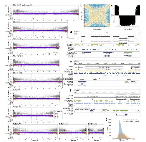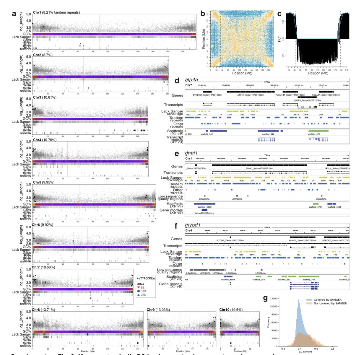 Supplementary Fig. 2 Xenopus tropicalis GC landscape, tandem repeats, and recovered genes. (a) Long arrays of tandem repeats localize to subtelomeric portions of the genome. A total of 68.27 Mb (4.71%) of the X. tropicalis (Xtr) genome assembly was not covered by Sanger shotgun sequences. Of the regions lacking Sanger read alignments, 48.6% overlapped with tandem repeats and 34.77% with other types of repetitive elements. Of the 4,718 CDS not supported by Sanger reads, 3,511 (74.41%) of them are localized in close proximity (< 2 kb) to tandem repeats. GC% content in distal subtelomeric regions is elevated, and regions lacking Sanger read coverage are more prevalent in the subtelomeres (48.6% of these regions overlap with tandem repeats). Telomere-associated tandem repeats, (TTAGGG)n, are indicated with plus ("+") symbols. Gaps in the current v10 reference genome assembly tend to co-localize with long tandem arrays. The locations of clusters of 5S (green), 18S (blue), and 28S (green) rRNAs, tRNAs, and snRNAs are indicated. Red vertical lines indicate the position of centromeres. (b) An example of subtelomere boundary inference for chromosome 1 (vs. chromosome 2) using feature selection with k-means clustering on a matrix selecting for repetitive Hi-C read placements in the subtelomeres (yellow, high-density corners), depletion of subtelomere-specific signal with the rest of the chromosome (blue edges), and background/aspecific repetitive signal (center). Dashed horizontal and vertical lines demarcate the inferred subtelomere boundaries. (c) Principal component analysis of the chromosome 1 matrix in panel b, decomposing variances into subtelomere-specific (positive Y values) and subtelomere-depleted repeat signals (negative Y values). Dashed vertical lines demarcate the inferred subtelomere boundaries. (d–f) IGV3 (v2.7.2) views from two fully-assembled loci in the current X. tropicalis (v10) assembly previously fragmented in the v9 assembly due to lack of Sanger read coverage. (d) atp4a (Xetrov107051369m; Chr7:129,430,384–129,450,182) was partially assembled in v9. Note that most regions not covered by Sanger (yellow) overlap repeats (blue). (e) dnai1 (Xetrov107008718m; Chr1:216,212,747– 216,291,747) was completely missing from v9 and is now captured in the v10 assembly. (f) Due to the highly repetitive nature of the sequence surrounding the myod1 locus (Xetrov107027728m; Chr4:719,782–1,128,311) this gene remains fragmented in the v10 assembly. The number below the “Lack Sanger coverage” track corresponds to the size of the fragment not covered by reads. (g) GC% distribution of genomic regions greater than 100 bp that were covered (n = 140,598) or not-covered (n = 95,475) by Sanger reads. kb, kilobases; Mb, megabases. Source data are provided as a Source Data file. |