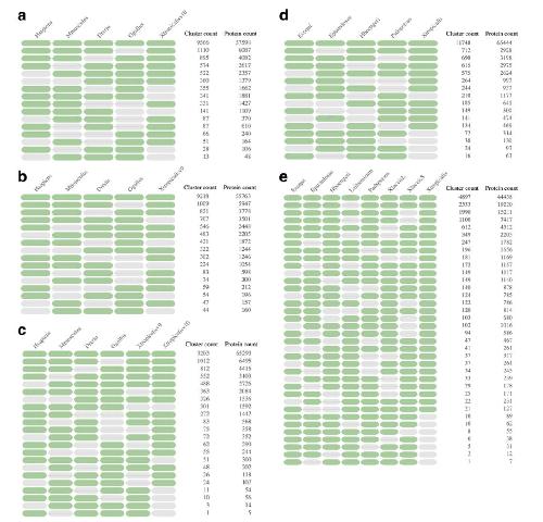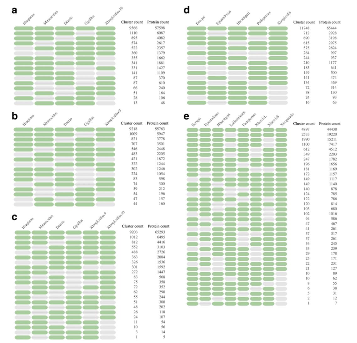 Supplementary Fig. 4 Comparison of gene content among assemblies. In the above occurrence tables, green and grey represent the presence or absence, respectively, of a species in a gene family cluster. The cluster count column summarizes the number of such gene family clusters with that occurrence pattern, while the protein count column lists the number of genes included in those gene clusters. Tables (a) containing three or more species with the v10 annotation primary transcripts, (b) containing three or more species with the v9 annotation longest transcripts4 (NCBI Annotation Release 103 of RefSeq assembly accession GCF_000004195.3 [https://www.ncbi.nlm.nih.gov/datasets/genome/GCF_000004195.3]), and (c) containing four or more species with both v9 and v10 against the longest transcripts of Danio rerio (NCBI Annotation Release 106 of RefSeq assembly accession GCF_000002035.6 [https://www.ncbi.nlm.nih.gov/datasets/genome/GCF_000002035.6]), Gallus gallus (NCBI Annotation Release 104 of RefSeq assembly accession GCF_000002315.6 [https://www.ncbi.nlm.nih.gov/datasets/genome/GCF_000002315.6]) Homo sapiens (NCBI Annotation Release 109 of RefSeq assembly accession GCF_000001405.39 [https://www.ncbi.nlm.nih.gov/datasets/genome/GCF_000001405.39]), and Mus musculus (NCBI Annotation Release 108 of RefSeq assembly accession GCF_000001635.26 [https://www.ncbi.nlm.nih.gov/datasets/genome/GCF_000001635.26]). Occurrence tables of gene homology clusters containing (d) three or more species among the five frog annotations newly generated for this study and (e) six or more members among the full set of seven frogs and—with both X. laevis L and S homoeolog sets represented—eight (sub)genomes analyzed here. All OrthoVenn25 clustering analyses were completed with the longest transcript amino acid sequences extracted using gff3ToGenePred and genePredToProt (UCSC Genomics Institute6 KentTools binaries downloaded March 5, 2019) as well as custom script largestgenePred.py (v1.0, https://github.com/abmudd/Assembly). Source data are provided as a Source Data file. |