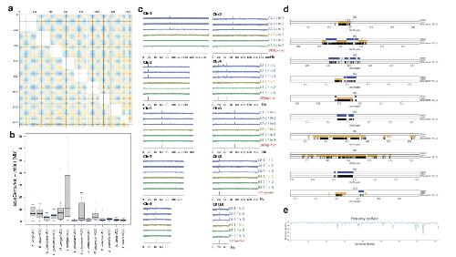 Supplementary Fig. 8 Chromosome fusions in Xenopus laevis and Hymenochirus boettgeri. (a) Heatmap of repeat density in X. laevis showing repeats enriched in subtelomeric (blue tracks), pericentromeric (orange tracks), and arm regions (grey tracks) for chromosome 7L and the fused chromosome 9_10S. Three bands of subtelomeric signal can be detected on chromosome 9_10S, the signal between 30 and 50 Mb corresponds to the fusion of the subtelomeres from ancestral pipid chromosomes 9 and 10. (b) Scatterplots of two subtelomeric repeats showing, for each X. laevis chromosome (X-axis), the length (Y-axis) and Jukes-Cantor (JC) distance of the repeats colored as indicated by the histogram on the bottom right. The dotted vertical line on the histogram indicates the 95th percentile. The median JC distances from subtelomeres from all chromosomes (JC = 0.054) is lower than the median JC distances from the region of the chromosome 9_10 fusion (JC = 0.157), and for the relatively recent p-arm inversion on chromosomes 8S (JC = 0.099) and 2S (JC = 0.076), suggesting that the p-arm inversions from chromosomes 8S and 2S7 occurred after the divergence from the pipid ancestor but after the fusion of chromosome 9_10S. Kolobok-N8_XL, a more recent repeat that expanded post-chromosome fusion and inversion of the p-arm of chromosomes 9S and 2S. (c) Hi-C contacts from chromosome 8_10 of H. boettgeri shows conserved intra-chromosomal contact boundaries compared to ancestral chromosomes 8 and 10. (d) Heatmap showing the density of subtelomeric repeats in H. boettgeri chromosome 8_10, between 85 and 120 Mb, from the fusion of ancestral chromosomes 8 and 10. (e) Enriched centromere-centromere contacts between H. boettgeri chromosome 1 (Y-axis) and chromosome 8_10 (X-axis), with the strongest centromeric interactions at x, y = 55 Mb, 170 Mb; suggesting that the active centromere of chromosome 8_10 was inherited from ancestral chromosome 10. A schematic of each chromosome, with pericentromeres colored black, are drawn along the axes. Enriched contacts shown in red, depletion in blue, and parity in white. Contacts enriched in the upper- and lower-right corners represent subtelomere-subtelomere contacts between the two chromosomes. Matrix of observed counts divided by expected counts, at 2.5 Mb matrix resolution (mapping quality ≥ 30, Knight-Ruiz balanced). bp, basepairs; Mb, megabases. Source data are provided as a Source Data file. |