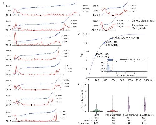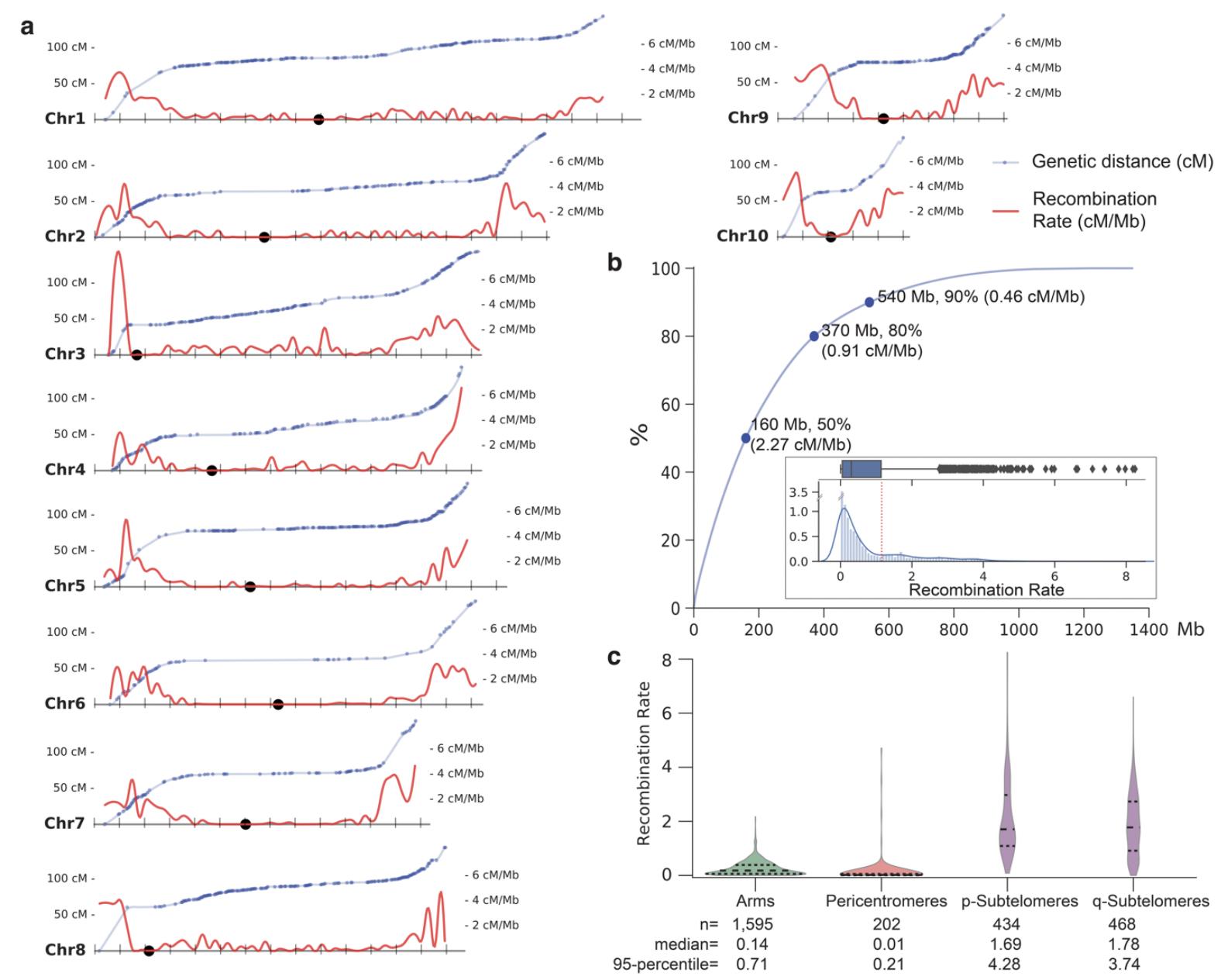 Supplementary Fig. 10 Xenopus tropicalis recombination landscape. (a) Scatterplot of physical (X-axis) vs. genetic (Y-axis) position of the genetic map based on the X. tropicalis v10 genome assembly. Genetic map distances (blue dots) smoothened by cubic spline linear interpolation (blue line). Recombination rates (cM/Mb, red line) were obtained from the smoothened genetic distances. (b) Cumulative distribution of recombination rates. The distribution of recombination rates (lower histogram) was used to determine genetic positions with high and low recombination (75th percentile, red dotted line). Boxplot whiskers represent 1.5 times the interquartile range, the left and right boundaries of the box bound the first and third quartiles, respectively, and the center line marks the median. (c) Recombination rate (cM/Mb) distribution per chromosomal segment: 5 Mb surrounding centromere (pericentromeres), 30 Mb from the end of chromosme arms (p- and qsubtelomeres, excluding pericentromeres of acrocentric chromosomes), and the remaining chromosome arms. Significant differences are observed between distributions of the arms vs. subtelomeres (Hochberg-corrected p = 5.2×10−321) and the arms vs. pericentromeres (Hochberg-corrected p = 3.2×10−42 ) using two-sample Kolmogorov–Smirnov two-sided tests. Mb, megabases; cM, centiMorgans. Source data are provided as a Source Data file. |