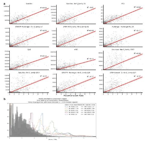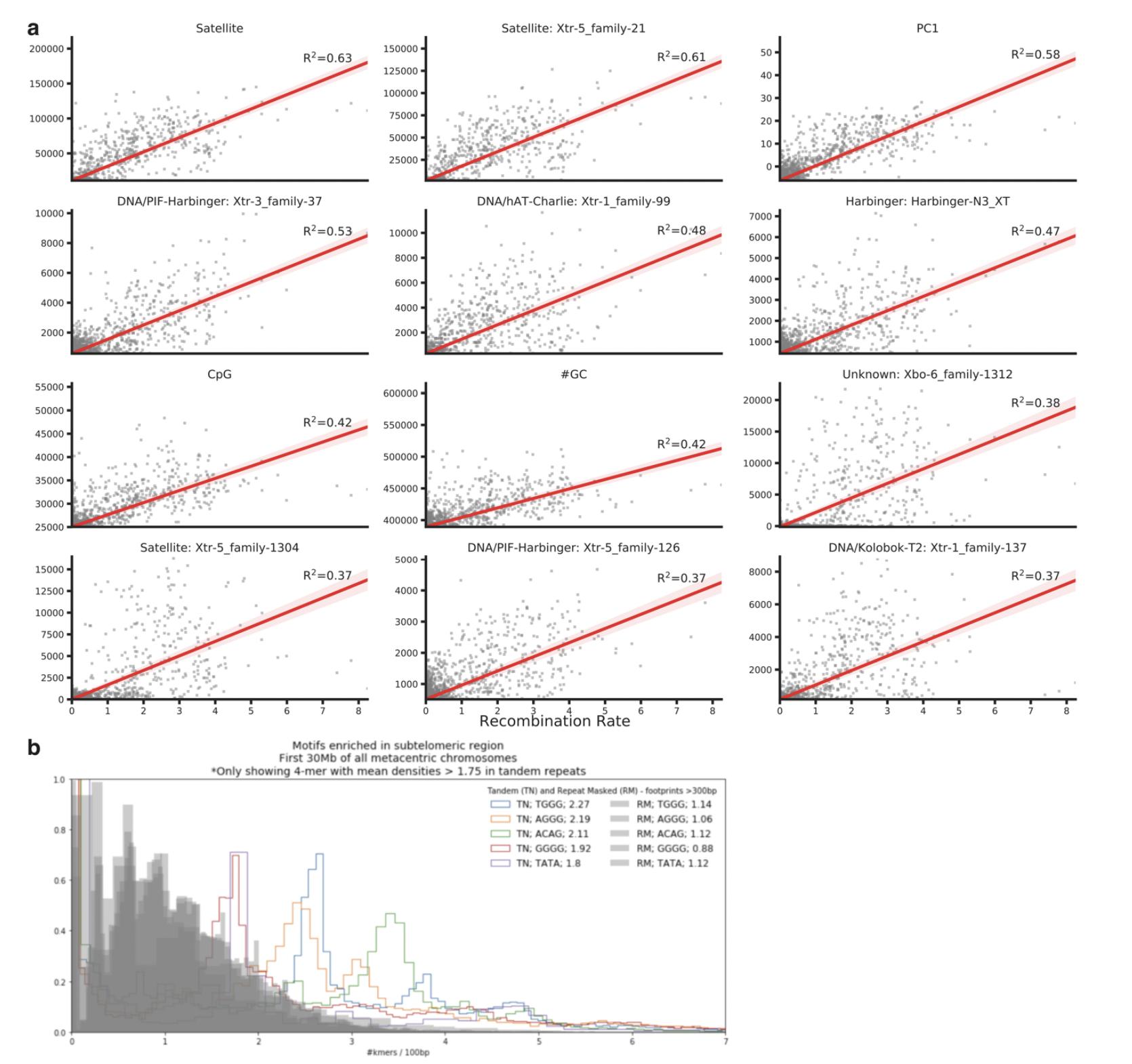 Supplementary Fig. 12 Correlates of recombination rate in Xenopus tropicalis. (a) Scatterplots comparing the genome-wide recombination rates (X-axis) against the 12 highest correlated genomic features. PC1 corresponds to the first principal component (PC) obtained from repeat densities. Y-axis is the number of bases per 1-Mb size bins for regions with available genetic markers. A table of all genomic features correlated with recombination rate can be found in Supplementary Table 14. Each red line is the linear regression model for the plotted data points, while each semi-transparent red band highlights the 95% confidence interval of the linear model. (b) Enriched tetramers in subtelomeric sequences. The distribution of tetramers in genomic regions (> 300 bp) overlapping tandem repeats and other non-tandem repeats (grey) in the distal subtelomeric portions of (sub)metacentric chromosomes. The two most enriched monomers (AGGG/CCCT and TGGG/CCCA) are similar to the 7-nucleotide oligomer CCTCCCT and CCCACCCC that have been associated with recombination hotspots in human8 and in mouse9 . bp, basepairs; Mb, megabases. Source data are provided as a Source Data file. |