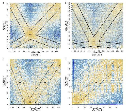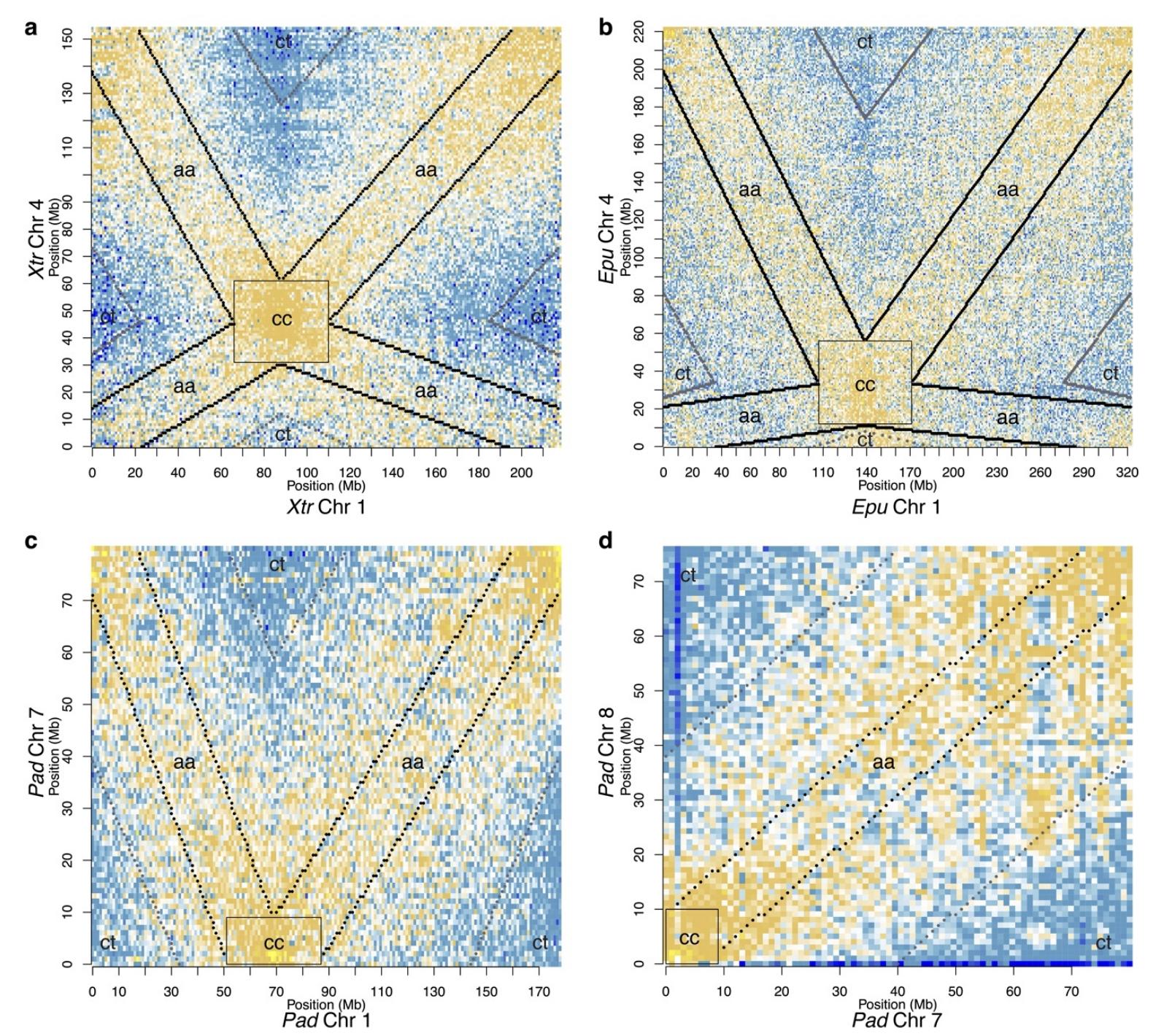 Supplementary Fig. 15 Enrichments of Rabl-like chromosome contacts. Select inter-chromosomal Hi-C contact matrices exemplifying different chromosome-structure combinations observed. Contact enrichment, parity, and depletion between 1 Mb non-overlapping loci colored gold, white, and blue, respectively. Regions of each matrix sampled to measure median centromere-centromere (cc, black outlined box), centromere-telomere (ct, grey dotted boundary lines), and centromere-to-telomere polarity arm-arm (aa, black dotted boundary lines) contact densities are labeled. (a) submetacentric X. tropicalis (Xtr) chromosomes 1 and 4; (b) submetacentric and acrocentric E. pustulosus (Epu) chromosomes 1 and 4, respectively; (c) metacentric and telocentric/acrocentric P. adspersus (Pad) chromosomes 1 and 7, respectively; and (d) telocentric/acrocentric P. adspersus (Pad) chromosomes 7 and 8. Mb, megabases. Source data are provided as a Source Data file. |