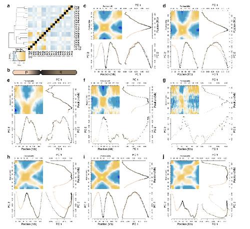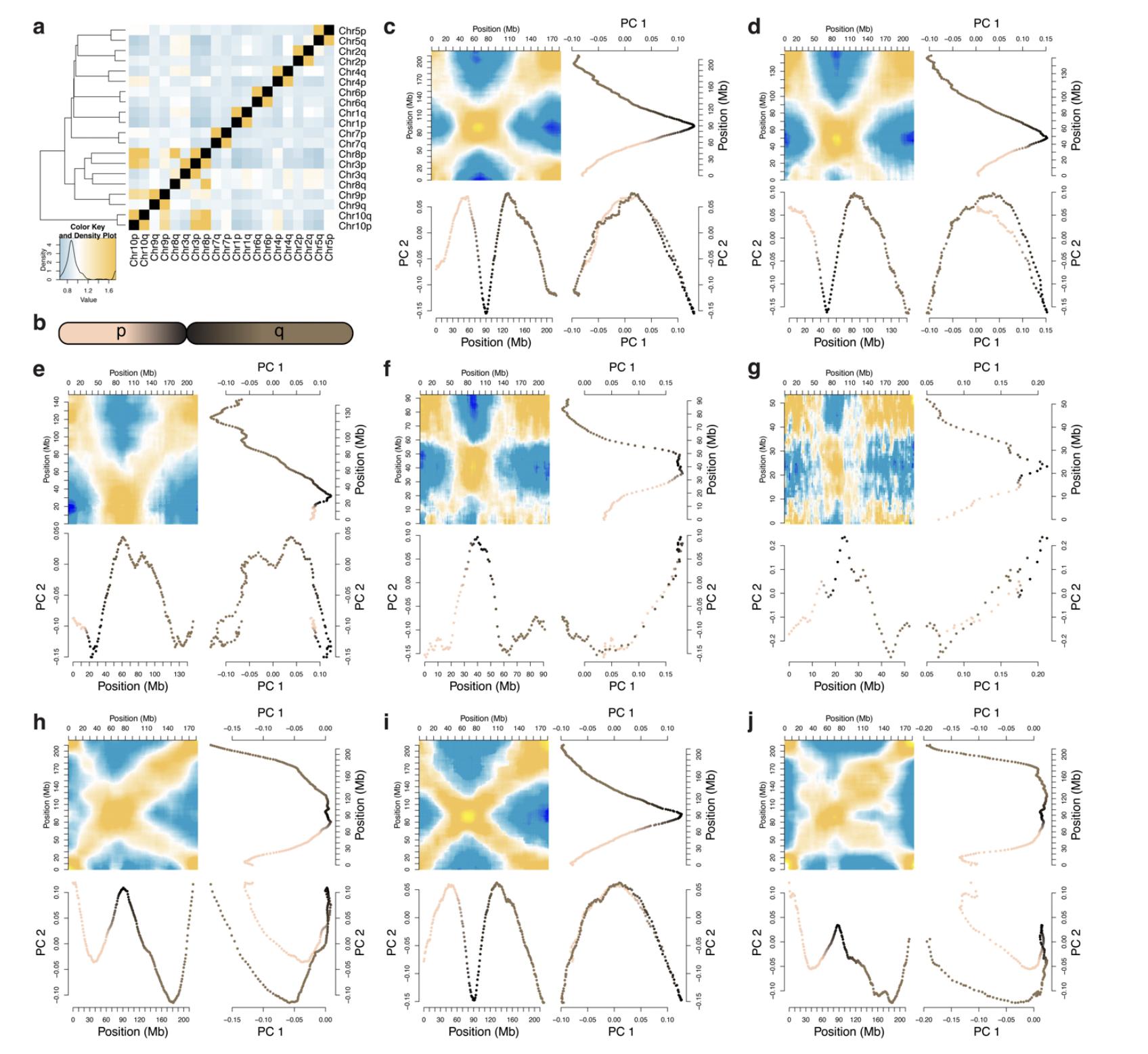 Supplementary Fig. 16 Xenopus tropicalis 3D chromatin structure and nuclear organization. (a) Genome-wide, a non-random association of chromosomal arm-arm contacts is observed (c2 (361, n = 28,366,570) = 58,25,879.96, Hochberg-corrected p < 4.46×10−308; inter-arm relative range: 0.654–3.829). Chromosome arms are 2.60× enriched for intra-chromosomal contacts over inter-chromosomal contacts (c2 (1, n = 4,957,102) = 979,083.44, Hochberg-corrected p < 4.46×10−308). Between chromosomes, p-p and q-q arms contacts are, respectively, 1.077× and 1.0412× enriched over p-q arm contacts (c2 (1, n = 24,786,496) = 17,037, Hochberg-corrected p < 4.46×10−308). Note: 4.46×10−308 is the post-correction value for 2.23×10−308, the lower numerical limit of a signed, double-precision floating-point value computed in the R statistical language on a 64-bit computer. See Supplementary Table 21 for association statistics for all species. (b) In panels c–j, PC1 or PC2 vector points are colored tan, black, and brown to differentiate 1-Mb windows along the p-arm, near the centromere, and the q-arm, respectively; a schematic of this coloring scheme is shown for clarity. Visualizing example Rabl-like chromatin configurations for (c) chromosome 1, blood cell nuclei; (d) chromosome 4, blood cell nuclei; (e) chromosome 8, blood cell nuclei; (f) chromosome 9, blood cell nuclei; (g) chromosome 10, blood cell nuclei; (h) chromosome 1, sperm; (i) chromosome 1, NF stage 8; (j) chromosome 1, adult brain. All contact maps generated using contacts with mapping quality ≥ 30. For visualization, the contrast level for each Hi-C contact density map has been adjusted to accommodate each dataset. The target chromosome is plotted on the Y-axis of each heatmap, with the comparator chromosome on the X-axis. Contact enrichment, parity, and depletion between 1 Mb non-overlapping loci colored gold, white, and blue, respectively. PC, principal component; Mb, megabases. Source data are provided as a Source Data file. |