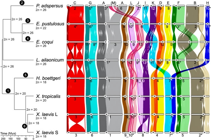 Fig. 1: Phylogenetic tree and gene ortholog alignment. The phylogenetic tree of the seven analyzed species, calculated from fourfold degenerate sites and divergence time confidence intervals, drawn with FigTree (commit 901211e, https://github.com/rambaut/figtree): Xenopus tropicalis, X. laevis, and Hymenochirus boettgeri (Pipoidea: Pipidae); Leptobrachium (Vibrissaphora) ailaonicum (Pelobatoidea: Megaphrynidae); Engystomops pustulosus (Neobatrachia [Hyloidea]: Leptodactylidae), Eleutherodactylus coqui (Neobatrachia [Hyloidea]: Euleutherodactylidae); and Pyxicephalus adspersus (Neobatrachia [Ranoidea]: Pyxicephalidae). The ancestral karyotype is labeled at each node on the tree. Black circles with white text refer to chromosome changes summarized in Table 1. The alignment plot was generated with JCVI using the 7292 described chromosome one-to-one gene orthologs from OrthoVenn2, followed by manual filtering of single stray orthologs. The Hi-C-derived centromere position is represented with a black circle on each chromosome. Ancestral chromosomes (A to M) are labeled at the top of the alignment based on the corresponding region in P. adspersus. The alignments for each ancestral chromosome are colored uniquely, with those upstream and downstream of the X. tropicalis centromeric satellite repeat colored in dark and light shades of the ancestral chromosome color. Chromosomes labeled with asterisks are shown reverse complemented relative to their orientations in the genome assembly. Mya millions of years ago, n the haploid chromosome number. Source data are provided as a Source Data file. |