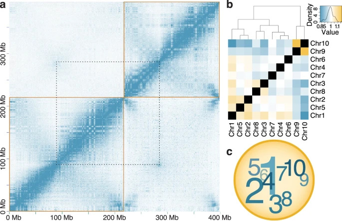 Fig. 4: Organization of X. tropicalis chromosomes into Rabl-like configuration and distinct nuclear territories. a Hi-C contact matrices for chromosomes 1 and 2 (lower-left and upper-right gold boxes, respectively) showing features of the three-dimensional chromatin architecture within X. tropicalis blood cell nuclei. Blue pixels represent chromatin contacts between X–Y pairs of 500 kb genomic loci, with intensity proportional to contact frequency. Hi-C read pairs are mapped stringently (MQ ≥ 30) above the diagonal and permissively (MQ ≥ 0) below the diagonal. The characteristic A/B-compartment (“checkerboard”) and Rabl-like (“angel wing”) interarm contact patterns within each chromosome are evident. Above the diagonal, an increased frequency of interchromosomal chromatin contacts is observed between pericentromeres (connected by dotted lines) and between chromosome arms (Supplementary Tables 18, 19, and 21), suggesting a centromere-clustered organization of chromosomes in a Rabl-like configuration. Below the diagonal, high-intensity pixels near the ends of chromosomes not present above the diagonal suggest a telomere-proximal spatial bias in the distributions of similar genomic repeats. See Supplementary Fig. 1e for a plot showing all chromosomes. b Chromosome territories within the nucleus. Yellow, white, and blue colors indicate the normalized relative enrichment, parity, and depletion of chromatin contacts between non-homologous chromosomes (Supplementary Tables 21 and 22). For example, chromosome 1 exhibits higher relative contact frequencies with all chromosomes except chromosomes 7, 9, and 10, which are generally depleted of contacts except among themselves (MQ ≥ 30; χ2 (81, n = 24,987,749) = 3,049,787; Hochberg-corrected P < 4.46 × 10−308; Relative range: 0.82774–1.16834). Note, due to the inbred nature of the Nigerian strain, contacts could not be partitioned by haplotype, and so the results reported here represent chromosomal averages. c Schematic representation of chromosome territories from (b). The size of each chromosome number is approximately proportional to the number of enriched interactions. Darker and lighter colors indicate chromosomes nearer and more distant to the reader, respectively. Mb megabases, MQ mapping quality. Source data are provided as a Source Data file. |