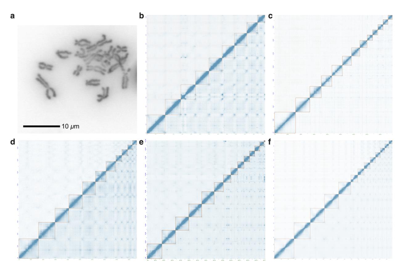 Supplementary Fig. 3 Assembly of five additional frog species. (a) A representative Hymenochirus boettgeri metaphase chromosome spread selected from among n = 75 independent cell spreads prepared from ten individual H. boettgeri tadpoles. Nine chromosome pairs can be observed for a karyotype of 2n = 18 (mode = 18, mean ± SEM = 18.09 ± 0.22). The scale bar represents 10 µm. Panels b–f present whole-genome Juicebox1,2 visualizations of Hi-C contact maps from (b) H. boettgeri, (c) Eleutherodactylus coqui, (d) Engystomops pustulosus, (e) Pyxicephalus adspersus, and (f) Leptobrachium (Vibrissaphora) ailaonicum chromosomes. Hi-C contact matrices balanced using the Knight-Ruiz algorithm, showing reads with a minimum mapping quality (MQ) ≥ 0 below the diagonal and reads with MQ ≥ 30 above the diagonal. Chromosomes (gold boxes) are shown in ascending numeric order along the X-axis and the intensity of blue pixels is proportional to chromatin contact frequencies between X-Y pairs of non-overlapping genomic loci. Source data are provided as a Source Data file. |