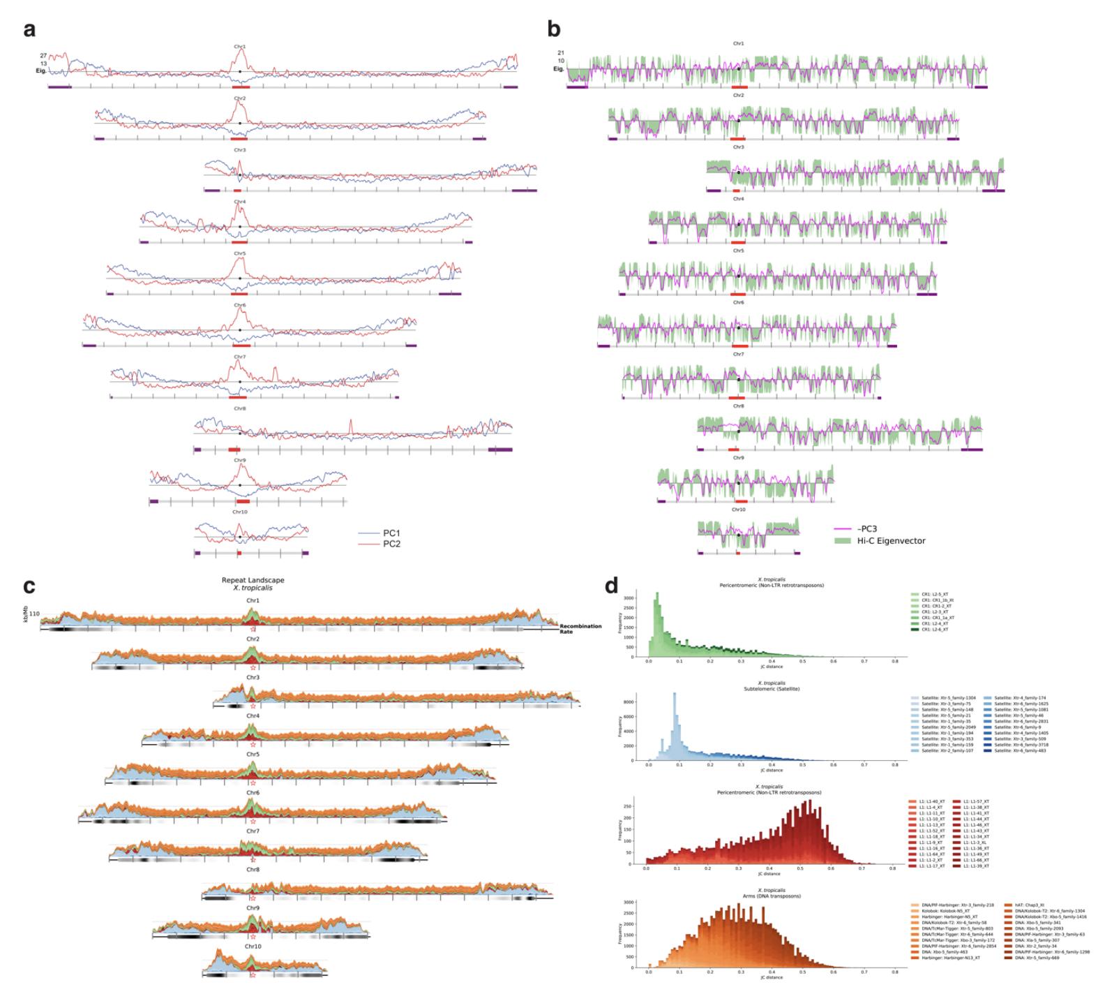 Supplementary Fig. 5 Xenopus tropicalis repeat density principal components projected on genomic coordinates. (a) The first two principal components (PCs) of the repeat density matrix describe subtelomeric and pericentromeric regions of the chromosomes. The first component (PC1, blue lines) strongly correlates with GC content (Pearson’s r = +0.796). The grey horizontal line is the value for which the smoothed PC2 (red lines) was thresholded to discriminate between distal-subtelomeric (purple boxes), pericentromeric (red boxes), and arm regions (grey) of each chromosome. Chromosomes are centered by the median position of centromere-associated tandem repeats (black dots). Tick lines correspond to distances of 10 Mb. (b) Plot as in panel a showing the third principal component (PC3, purple lines) of the repeat matrix plotted with the eigenvector that defines A/B compartment structure (green; A and B compartments above and below the X-axis, respectively) obtained from the Hi-C contact matrix. PC3 and the Hi-C-derived eigenvector show a moderately negative correlation (Pearson’s r = −0.64) when analyzed in 500 kb windows along the genome. This negative correlation with PC3 is maintained, although weaker, when the analysis is repeated with consecutive Hi-C windows with equivalent signs collapsed into larger A/B compartment domain block intervals (Pearson’s r = −0.44). Harbinger-N9_XT is positively associated with PC3 (Pearson’s r = +0.50), whereas DNA/hAT-Ac appears strongly negatively correlated with PC3 (Pearson’s r = −0.80). (c) Repeat landscape of L1 (red) and CR1 (green) Non-LTR retrotransposons, satellite repeats (blue), and DNA transposons (orange). Recombination rate plotted along the X-axis as a density gradient track (black = high, white = low). Centromere positions are represented with red stars. (d) Jukes-Cantor (JC) distance (X-axis) from the consensus sequence for the repeats shown in panel a. Only the most abundant L1 repeat families are shown from panel b. kb, kilobases; Mb, megabases. Source data are provided as a Source Data file. |