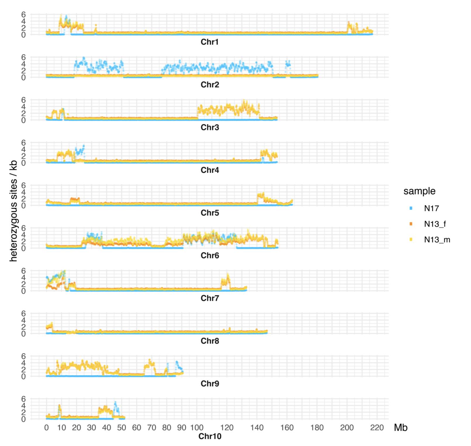 Supplementary Fig. 6 Xenopus tropicalis Nigerian strain residual heterozygosity. Heterozygosity rates for the N17 genome frog (an F17 inbred line; blue) and two pooled F13 inbred Nigerian strain datasets: N13_f, eight Nigerian females (orange); and N13_m, twelve Nigerian males (yellow). Rates are measured as heterozygous SNP positions per kilobase. kb, kilobases; Mb, megabases; SNP, single-nucleotide polymorphism. Source data are provided as a Source Data file |