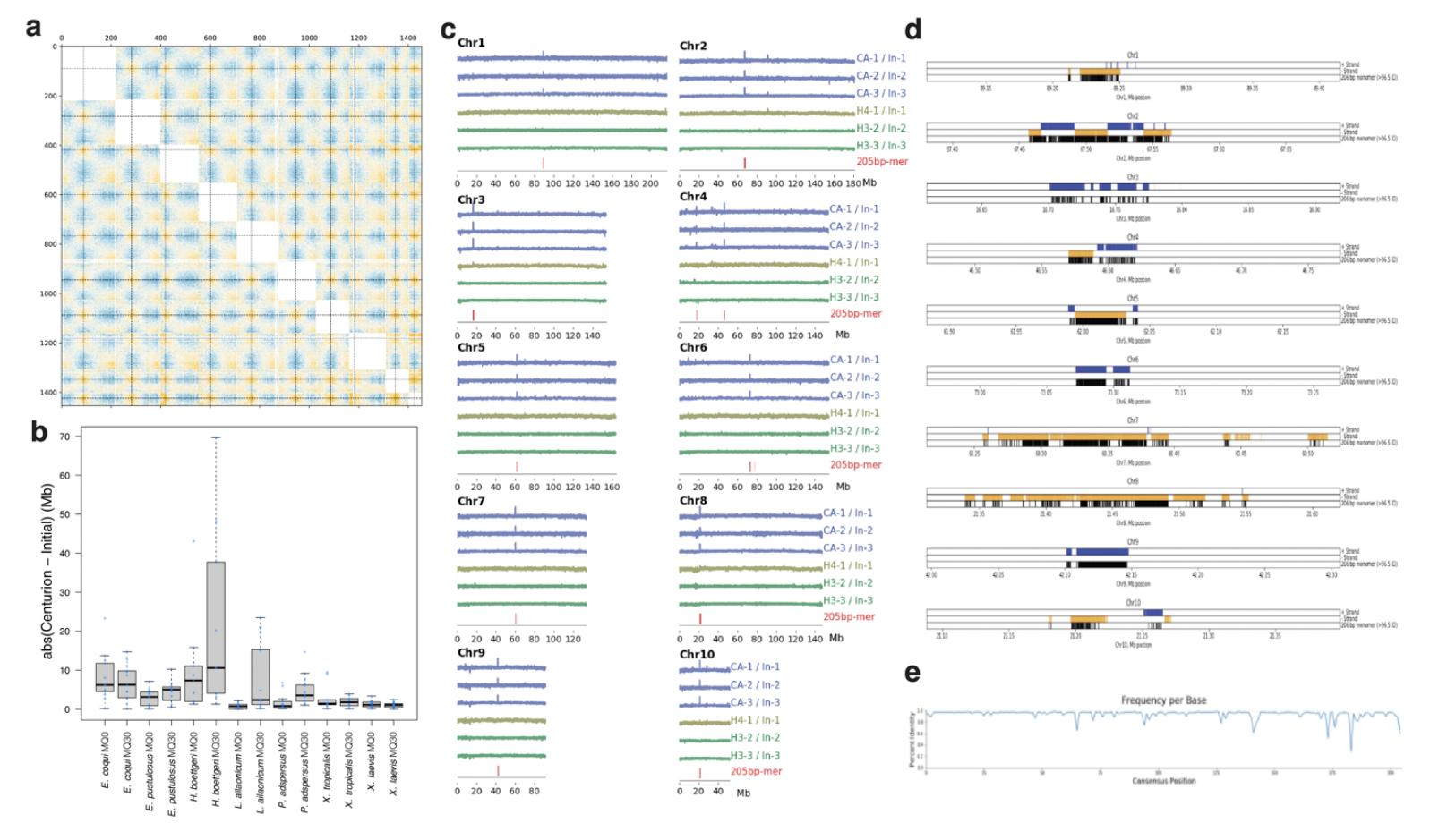 Supplementary Fig. 9 Estimating the positions of Xenopus tropicalis centromeres. (a) Genome-wide Hi-C contact map of X. tropicalis. Intersecting horizontal and vertical dashed black lines mark the Centurionestimated centromeres. Yellow puncta reflect centromere-centromere contact enrichment between chromosomes, suggesting centromere clustering on the inner nuclear periphery. Yellow, white, and blue colors indicate the normalized relative enrichment, parity, and depletion (respectively) between a pair of 1 Mb genomic loci. Intra-chromosomal contacts have been masked (solid white boxes). Axis coordinates in Mb. (b) Box plots comparing the variation in differences between manual and Centurion centromere estimates by mapping quality (MQ) for thresholds MQ ≥ 0 (MQ0) and MQ ≥ 30 (MQ30), where each blue point represents an estimate for a single chromosome. For each boxplot, n = the haploid number of chromosomes for the species-MQ combination indicated (X-axis). Lower and upper box edges denote the first and third quartiles, respectively, and whiskers extend to 1.5 times the interquartile range, while thick center lines represent medians. (c) ChIP-seq signal for Cenp-a, Histones H4 and H3. Samples are normalized by the read depth of the DNA associated with free-mononucleosomes (input). The presence of 205 bp tandem monomer sequences associated with Centromeric Tandem Repeats is indicated in red. (d) Zoomed-in view showing the organization of tandem centromeric repeat sequences (monomer = 205 bp) for each chromosome. A 300 kb window surrounding the presumptive centromeric repeats. Monomers found in the forward and reverse strands are shown in blue and yellow, respectively. Monomers sharing above 95% identity to the repeat consensus are shown in black. (e) The percentage of the major base per position of the multiple alignment of 3,693 genomic BLASTN hits from the initial 205 bp monomer sequence. To generate the 205 bp consensus we considered the most represented base per site (positions where alignments were over 50% gaps were omitted). bp, basepairs; kb, kilobases; Mb, megabases. Source data are provided as a Source Data file. |