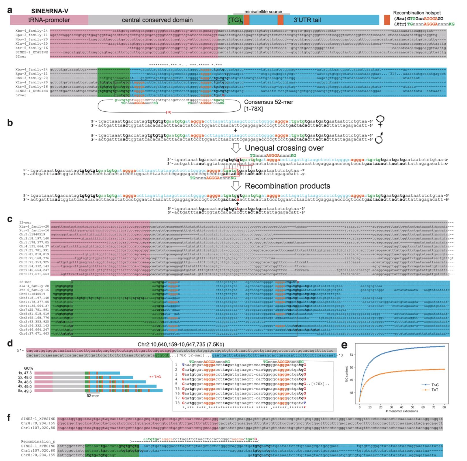 Supplementary Fig. 14 Microsatellite origin SINE/tRNA evolved into a microsatellite sequence. (a) A schematic of the structure of Xenopus SINE/tRNA (top), as described by Ogiwara et al.11. The nucleotide sequence alignment of consensus SINE/tRNA obtained from different frog species (bottom) and the 52-mer sequence where the minisatellite sequence was derived. The multiple sequence alignment (MSA) of the consensus SINE/tRNA identified for the frogs in this study (except E. coqui) shows high levels of sequence similarity. MSA regions colored as in the schematic. The alignment includes the 52-bp monomer sequence that conforms to the minisatellite. The 52-mer consensus sequence shows perfect alignment with X. tropicalis (Xtr) and X. laevis (Xla). The last base of the monomer is a “G” substitution of a “T.” Notice that E. pustulosus (Epu), X. borealis (Xbo), and H. boettgeri (Hbo) lack the first “AGGA” box from the consensus sequence. (b) Representation of an unequal crossingover event between a pair of unequally-aligned 3'UTR SINE/tRNA sequences. The unequal crossing over produces a duplication of the 51-mer + “G” (top) and a deletion of the sequence (bottom). (c) An example of the alignment of an intact SINE/tRNA in X. tropicalis genome. MSA regions colored as in the schematic in panel a. (d) Example of an ancestral SINE/tRNA (Chr2:10,640,159– 10,647,735) that contains 78 copies of the 52-mer sequence and has extended over 7.5 kb in length. Sequence regions colored as in the schematic in panel a. (e) The GC% of the consensus SINE/tRNA oscillates between 46 and 48%, while the sequence of the monomer is slightly higher at 51% (51.9% with the addition to the T>G substitution), thus it would be expected that the extension of the tandem would cause a gradual increase in local GC content (see graph on the right). (f) Example of the deletion of the 52-mer that possibly resulted from unequal crossing over. MSA regions colored as in the schematic in panel a. Hsa, Homo sapiens; bp, basepairs; kb, kilobases. Source data are provided as a Source Data file. |