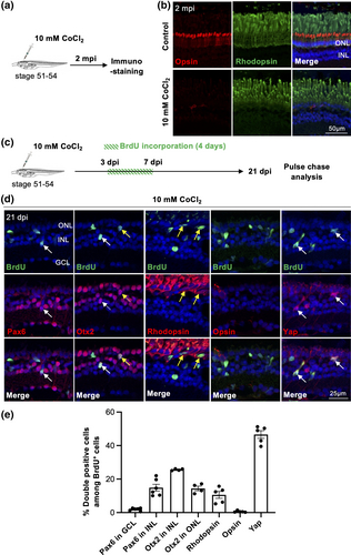 Neurogenic potential of proliferative Müller cells following a 10 mM CoCl2 intraocular injection in X. laevis. (a) Outline of the experimental procedure used in (b). Stage 51–54 tadpoles were intraocularly injected with a saline solution (control) or with 10 mM CoCl2. They were then processed for immunostaining 2 months post-injection (mpi). (b) Representative images of retinal sections co-labeled for Rhodopsin and Opsin. (c) Experimental procedure of the pulse-chase experiment performed in (d-e). Stage 51–54 tadpoles were intraocularly injected with 10 mM CoCl2 and subjected to BrdU exposure from 3 to 7 dpi to label all proliferative Müller cells. They were then processed for immunostaining at 21 dpi. (d) Representative images of CoCl2 injected retinas co-labeled at 21 dpi for BrdU and either Pax6 (identifying ganglion cells in the GCL and amacrine cells in the INL), Otx2 (identifying bipolar cells in the INL and photoreceptors in the ONL), Rhodopsin (rods), Opsin (cones), or Yap (Müller cells). White and yellow arrows point to double-positive cells in the INL and ONL, respectively. (e) Proportions of the different retinal cell types among BrdU-labeled ones. In (b, d), nuclei are counterstained with Hoechst. Data are represented as mean ± SEM, and each point represents one retina. GCL, ganglion cell layer, INL, inner nuclear layer, ONL, outer nuclear layer. |