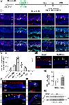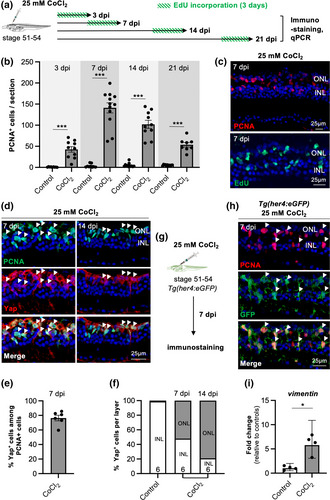 Massive Müller glia proliferation following a 25 mM CoCl2 intraocular injection in X. laevis. (a) Outline of the experimental procedure used in (b-f). Stage 51–54 X. laevis tadpoles were intraocularly injected with a saline solution (control) or with 25 mM CoCl2. They were then processed for immunostaining or qPCR at different time points, as indicated. For EdU labeling, tadpoles were exposed to EdU three days prior to fixation. (b, c) Quantification of PCNA-positive cells and representative images of PCNA- or EdU-labeled retinal sections from CoCl2-injected tadpoles at 7 dpi. (d-f) Analysis of PCNA and Yap co-labelling at 7 and 14 dpi. Shown in (d) are representative images of retinal sections. Arrowheads point to double-positive cells. The graph in (e) is the quantification of Yap-positive cells among PCNA-labeled ones. Shown in (f) is the distribution of Yap-positive cells in the different retinal layers. (g) Outline of the experimental procedure used in (h). Stage 51–54 transgenic Tg(her4:eGFP) tadpoles were intraocularly injected with 25 mM CoCl2. They were then processed for PCNA and GFP co-immunostaining at 7 dpi. (h) Representative images of retinal sections. Arrowheads point to double-positive nuclei. (i) qPCR analysis of vimentin expression in control or 25 mM CoCl2-injected retinal extracts at 7 dpi. Data are represented as geometric mean with 95% CI (n = 4 biological samples). In all images, nuclei are counterstained with Hoechst. In (b, e), data are represented as mean ± SEM, and each point represents one retina. In (f), the number of analyzed retinas is indicated at the bottom of each bar. *p < .05, ***p < .001 (Mann-Whiney tests). INL, inner nuclear layer; ONL, outer nuclear layer. |